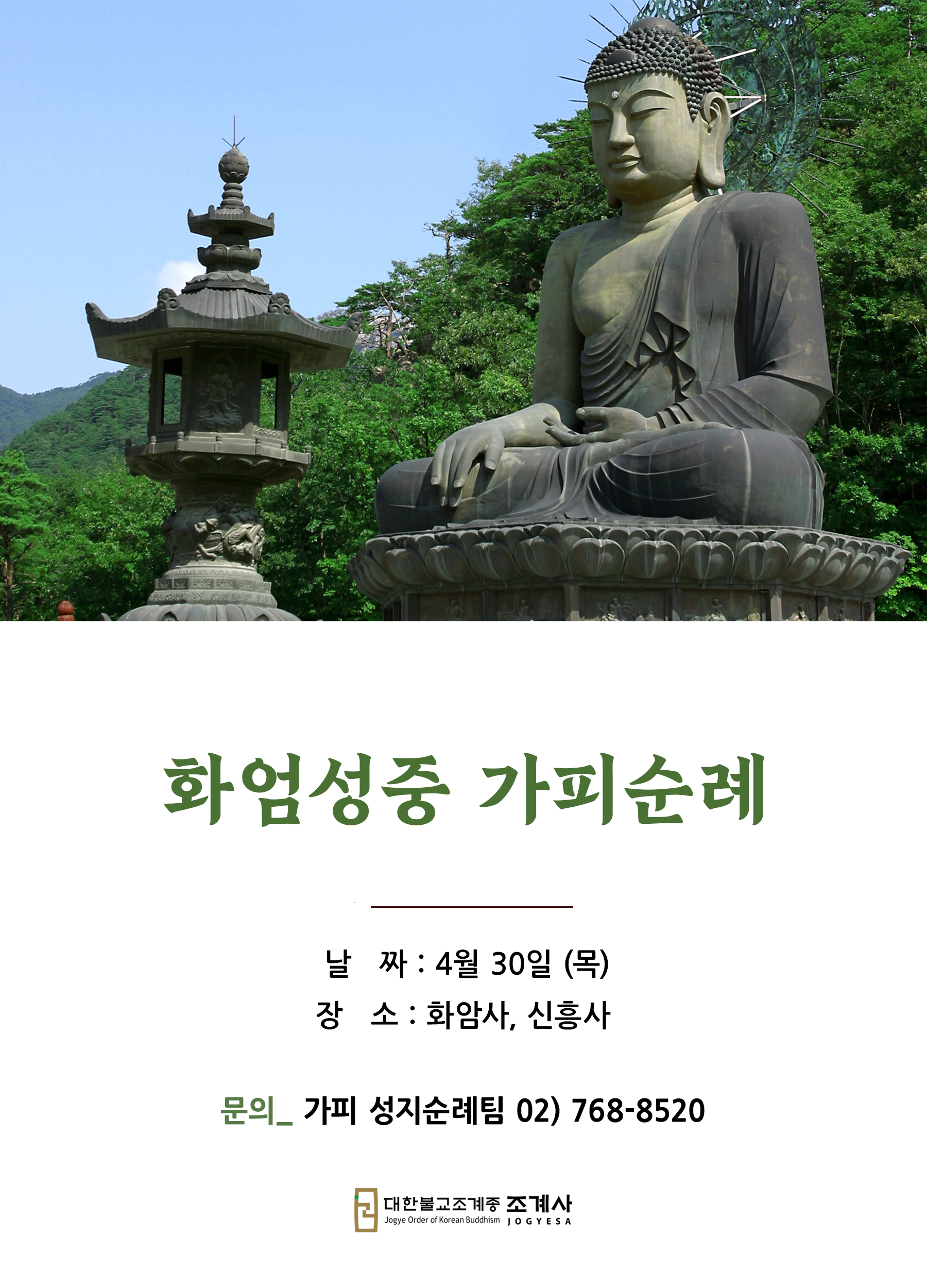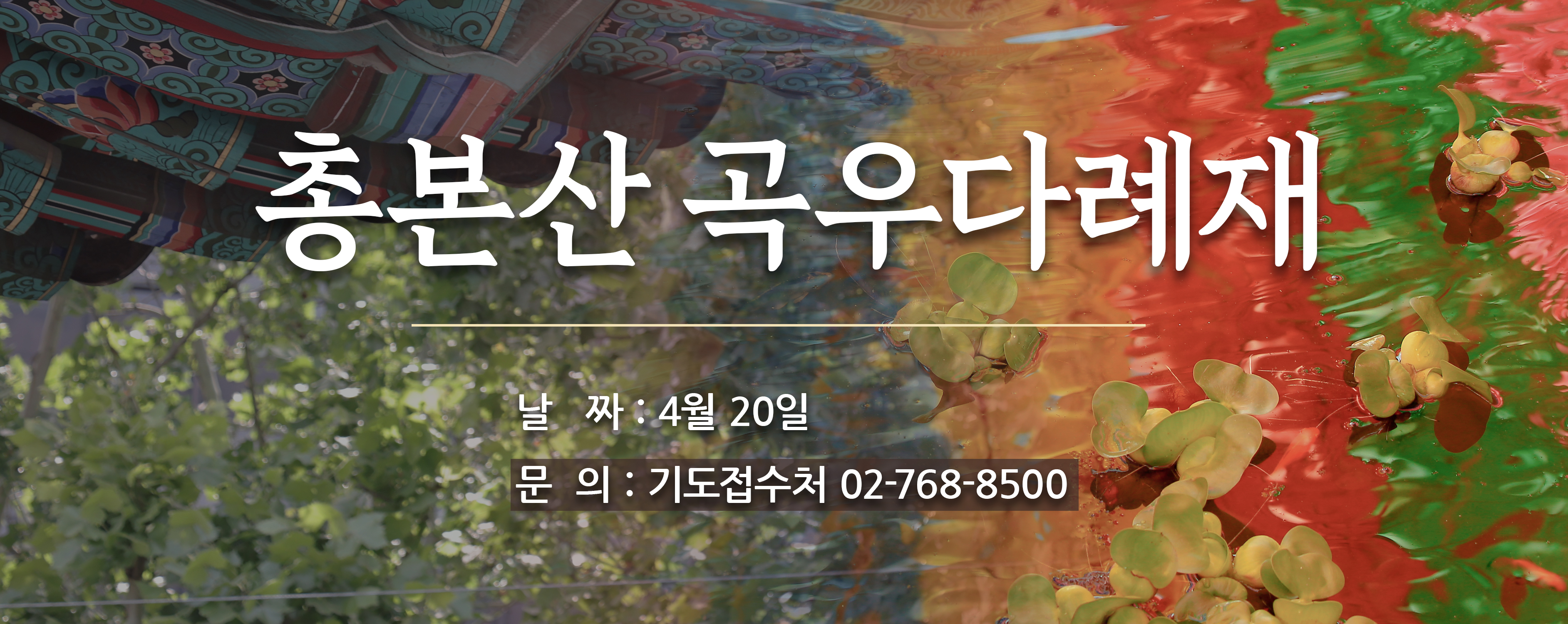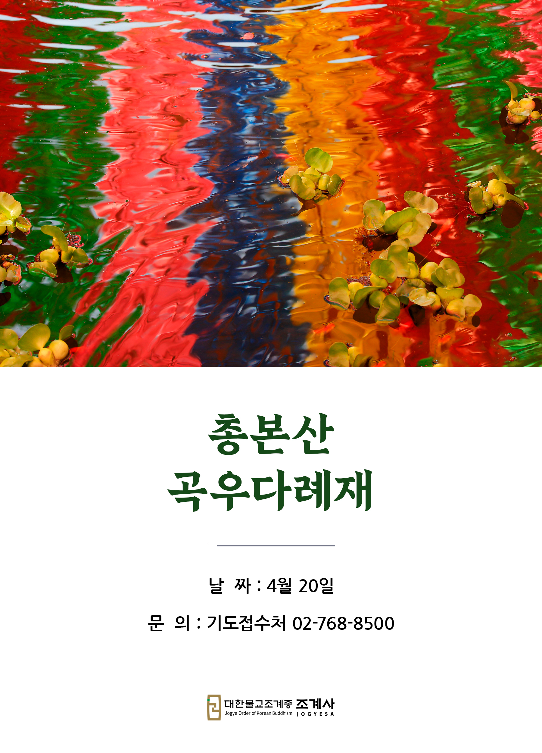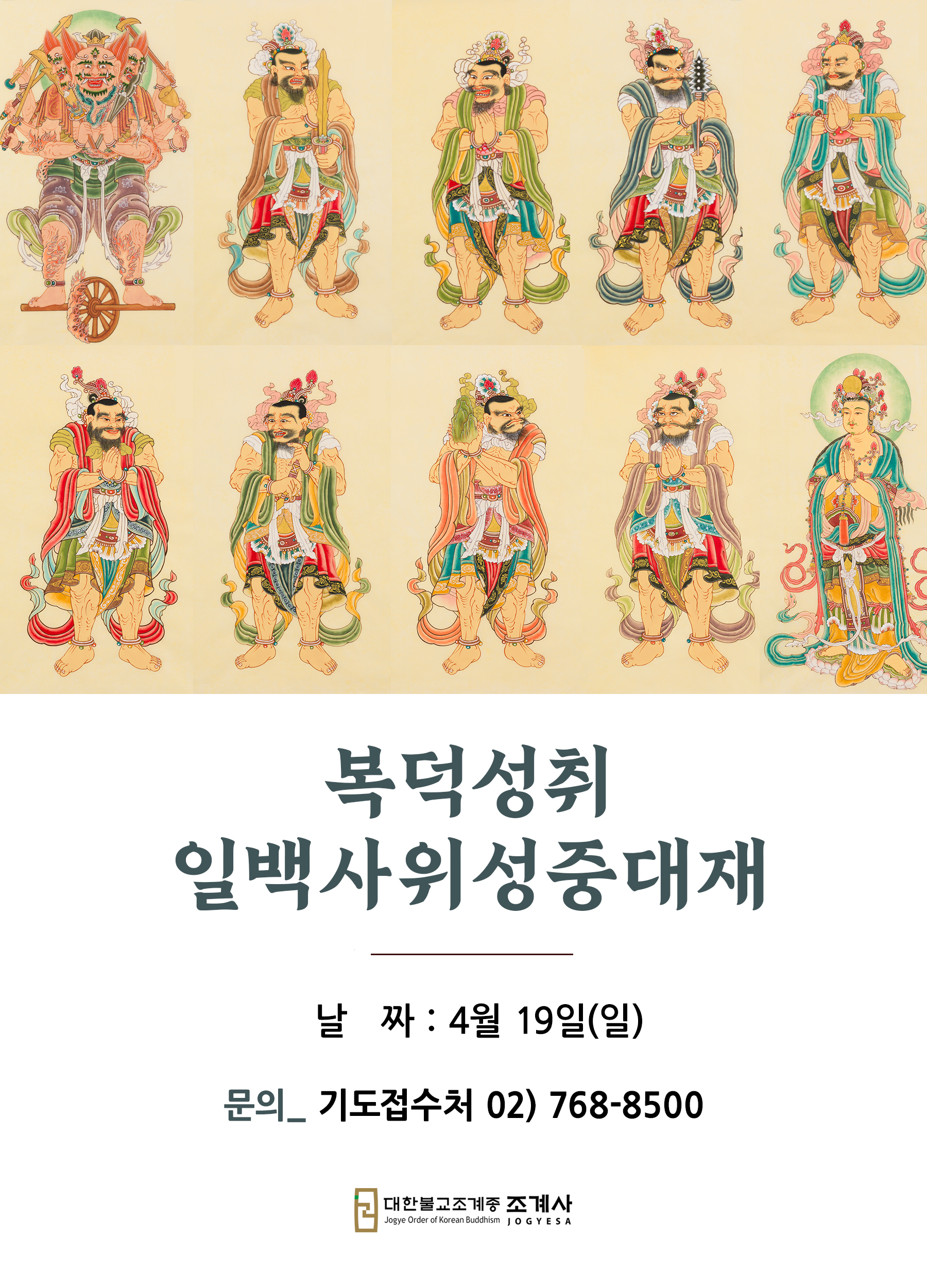 4월 9일 '가족을 위한 행복한 동행 100일 관음기도'를 입재했다. ‘가족을 위한 행복한 동행 100일 관음기도’는 100일간 오후 2시에 진행되고 7월 17일(금, 음 6/4)일 회향한다. ●문의: 조계사 기도접수처 02-768-8500
