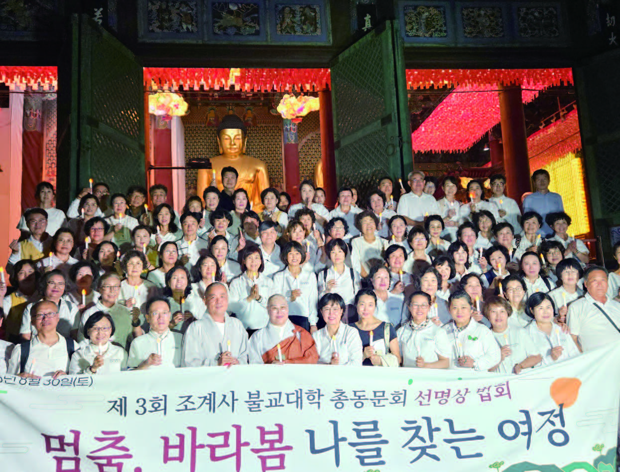 조계사 불교대학은 지난 수십 년 동안 수많은 불자들 에게 부처님의 가르침을 전하며, 지혜와 자비의 씨앗을 뿌려온 신행 교육의 장이다. 불교대학의 교리와 경전 공부는 단순한 지식의 축적을 넘어 일상 속에서 불법을 실천할 수 있는 삶의 방향을 제시해왔다. 이러한 교육적 토대 위에서 총무원장 진우스님이 제창한 ‘선명상(禪明想)’은 현대 사회 불자들이 체득해야할 새로운 수행법으로 자리매김하고 있다. 총무원장스님은 선명상에 대해 “마음을 평안하게 하는 길이며, 괴로움의 굴레에서 벗어나는 방법”이라고 강조하셨다. 분별심에서 비롯되는 시비와 대립을 내려놓고지금 이 순간 깨어 있는 마음으로 돌아가는 것이 바로 선명상의 본질이다. 지난 8월 23일 저녁 7시, 조계사에서는 <불교대학총동문회 선명상 법회>가 열렸다. 이날 법회에는 약120여 명의 불자들이 동참하여 선명상의 의미를 되새기고 직접 수행을 체험했다. 첫 순서로 사회사서국장 명경스님이 법석에 올라 이론과 실제 수행법을 강연하며 “선명상은 부처님의 가르침을 현대적으로 풀어낸 실천의 장”임을 강조했다.