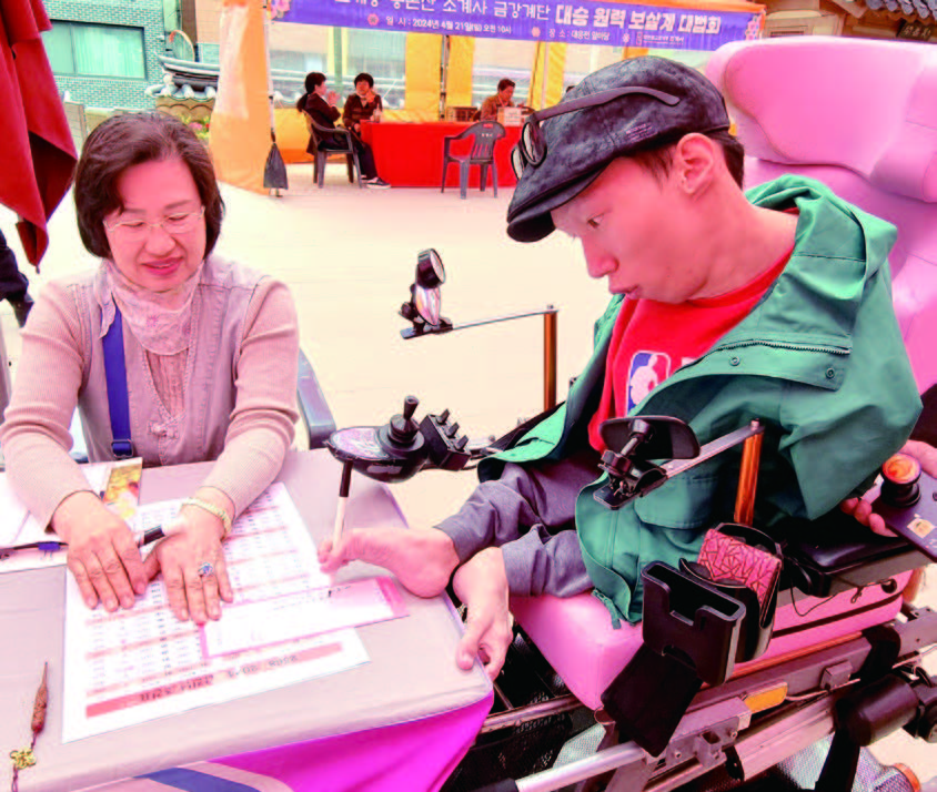 이날 서울노인복지센터 관장 지웅스님과 함께 조계사를 방문해 대웅전 아미타부처님 개금불사기금을 전달한 주인공은 아이처럼 작은 체구에 두 팔이없는 청년이었습니다.발가락으로 마이크를 쥐고 또박또박 발원문을 낭독한 이 청년의 이름은 운정 유태호. 올해로 스물여섯 살, 장애인 인권활동가이자 사회복지학을 전공하는대학생입니다. 끈질기게 이어지던 가을장마가 그치고 오랜만에 파란하늘이 드러난 어느 날, 유태호 불자를 만나 개금불사에 동참하게 된 배경부터 남다른 성장 과정, 지웅스님과의 인연까지 속 깊은 이야기를 나누었습니다.