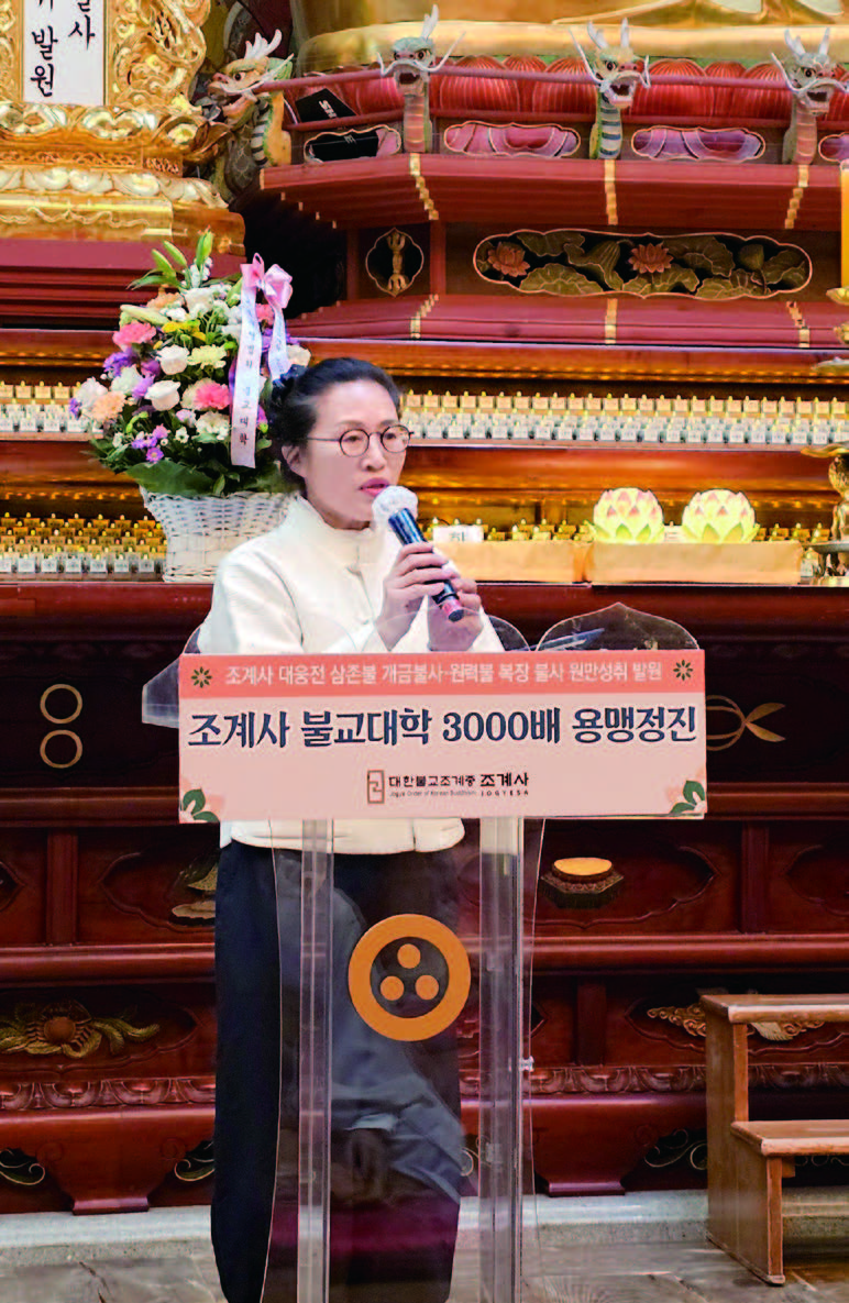 안녕하셔요. 교육수행법회장 소임을 보고 있는 호연 김경숙입니다. 교육수행법회는 작년 한 해는 “깨자! 깨자! 깨자!”라는 슬로건 아래 봉사와 정진을 해 왔습니다. 이 짧은 세 마디에는 봉사와 공부의 매 순간 되새겨야 할 마음가짐, 그리고 불교의 핵심 가르침이 고스란히 담겨 있습니다. ‘내가 옳다’는 아집으로 누군가를 불편하게 하지 않았는지 마음속 선입견을 내려 놓으며, 지금 이 순간 깨어 있으려는 수행의 지속성을 뜻합니다. 상대를 판단 분별하지 말고 있는 그대로 받아들이며, 뭔가 트러블이 있다면 그럴 만한 사정이 있음을 살피는 것. 이 모든 것이 곧 깨달음의 길입니다. 작년 한 해 우리의 기도와 봉사 활동에서 이 슬로건은 늘 중심이 되어 주었습니다. 불교대학, 불교대학원, 선림원 수업과 열린 대법회 강좌, 3000배 철야 용맹정진, 선지식 초청 참선대법회, 화엄성중 가피순례, 만발, 접수봉사 등 모든 자리에서 ‘일상의 깨어남’을 실천하고자 애써 주신 모든 분들께 깊이 감사합니다. 수행은 특별한 순간에만 이루어지는 것이 아니라, 매일의 작은 선택과 마음가짐 속에서 드러납니다. 사소한 말 한마디, 누군가를 바라보는 시선, 잠시 멈추어 호흡을 들여다보는 그 순간까지—그것이 곧 수행임을 함께 확인했습니다. 교육수행법회는 ‘공부하는 공동체’를 지향하며 다양한 강의와 프로그램 속에서 불교의 깊은 가르침을 현대적으로 해석하고, 일상에 적용할 수 있는 수행 실천법을 함께 공부함으로써 자기 삶을 주체적으로 비추는 힘을 기를 수 있도록 노력했습니다. 강사님과 스님들의 가르침뿐 아니라 봉사하고 서로의 경험을 나누고 공감하는 과정에서 화합하고 공동체적 수행의 힘도 더욱 단단해졌음을 느낄 수 있었습니다. 빠르게 변하는 시대 속에서 공부와 수행을 지속하기 어렵다고 말씀하시는 분들도 있었고, 중도에 그만 두시는 분들도 있었습니다. 그러나 그럼에도 “깨자(선입견을 깨자)! 깨자(지금 이 순간에 깨어 있자)! 깨자(깨닫자)!” 라는 외침은 흔들리는 우리의 마음을 다시 중심으로 돌아오게 하는 약속이 되어 주었습니다.