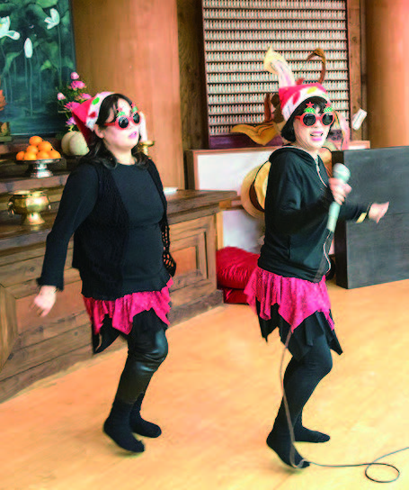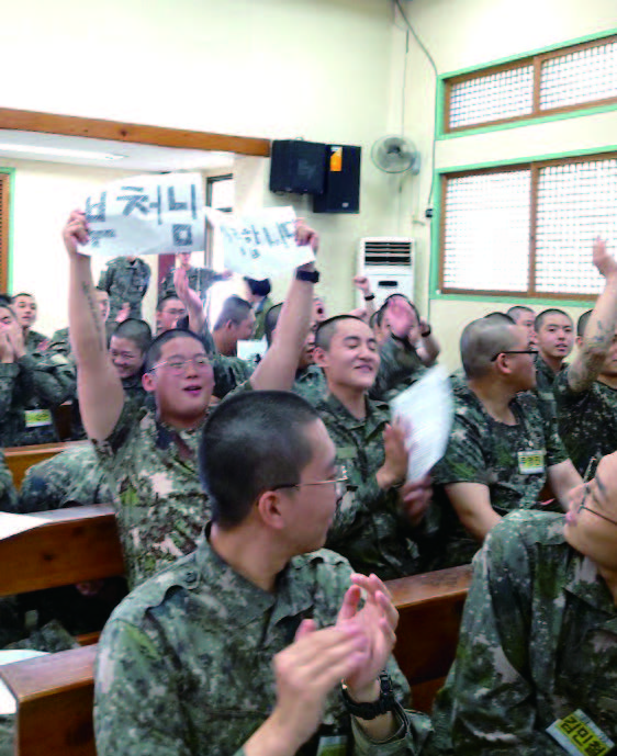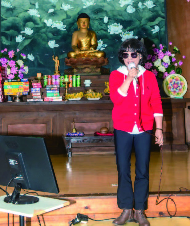 가수 이선희의 노래 ‘인연’이 1사단 신병교육대 법당 ‘정각원’에 잔잔히 울려 퍼지자, 긴장으로 굳어 있던 훈련병들의 마음이 서서히 열리기 시작합니다. 귀여운 복장과 진심 어린 노래로 훈련병들에게 다가가는 조계사 직장직능대승전법단 자비행 김진자 법우의 음성공양에는 훈련병들을 향한 사랑과 부처님께 귀의하기를 바라는 간절한 발원이 담겨 있습니다. 노래가 끝나자 힘찬 박수와 ‘앵콜’ 함성이 법당을 가득 채웠고, 이어진 신나는 곡과 율동에 훈련병들은 잠시나마 훈련의 긴장을 내려놓고 젊음의 에너지를 마음껏 발산했습니다.