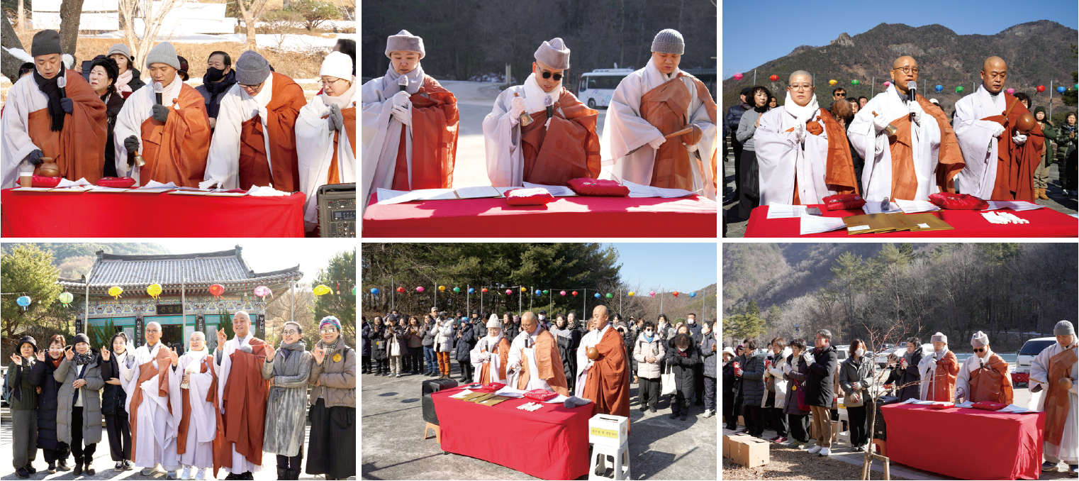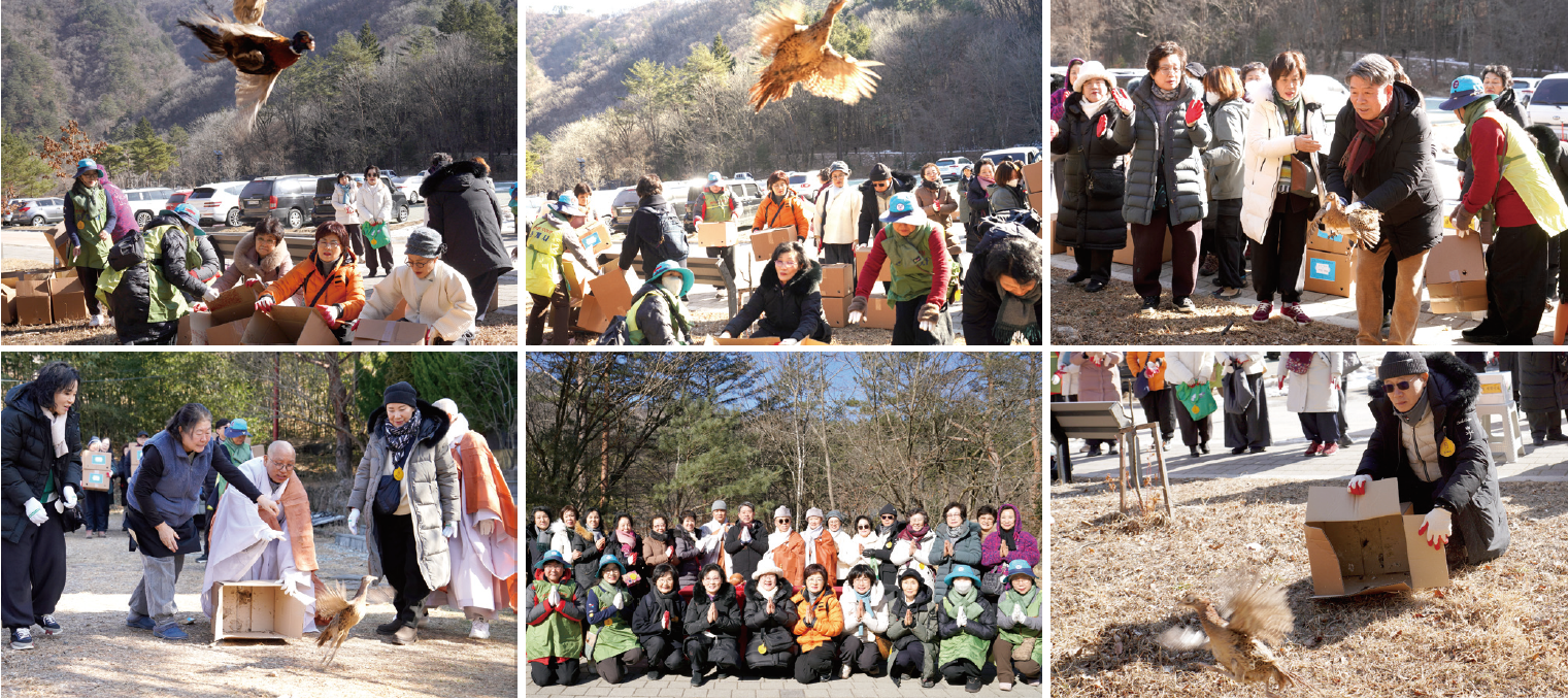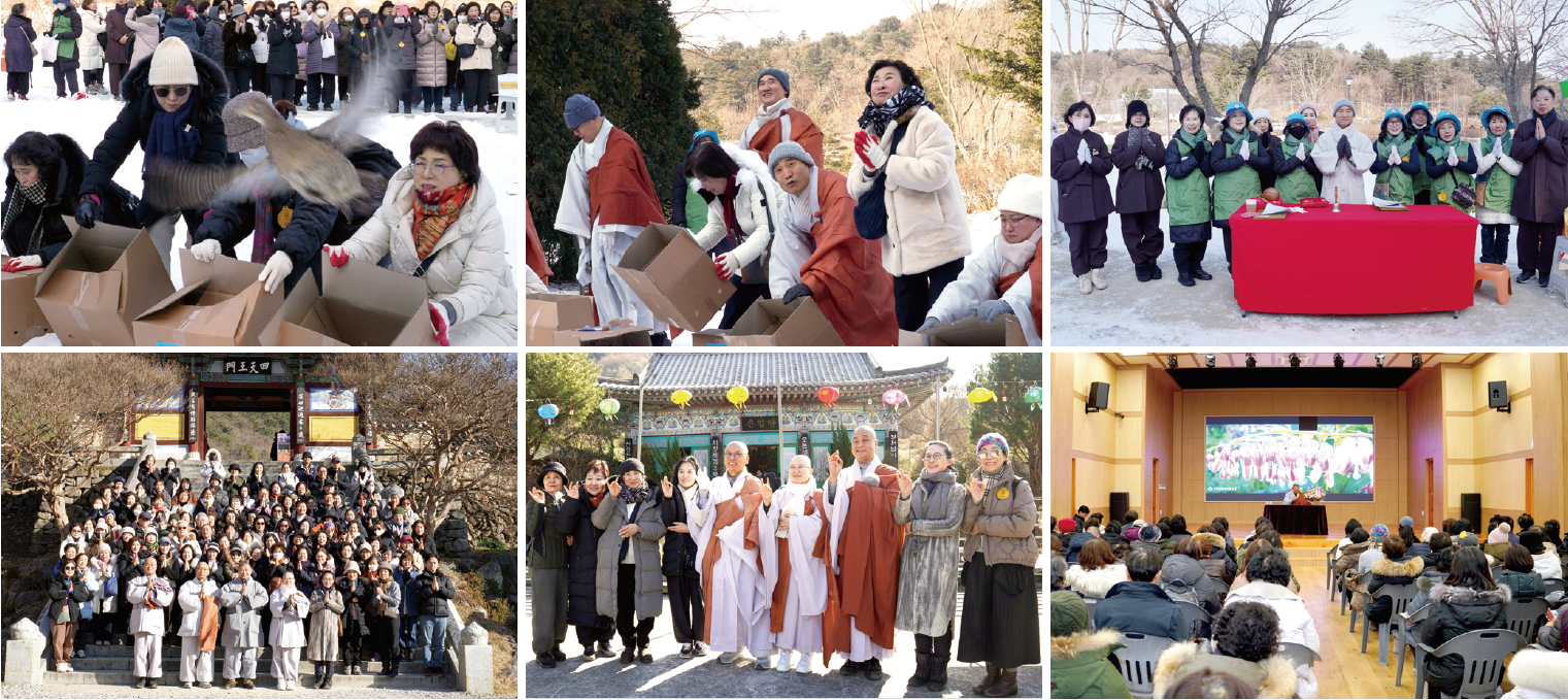 첫 번째 순례지인 동화사에서는 교구장 스님께서 “복 짓는 방법을 가르쳐 드리기 위해 수행 정진하시는 스님들과 좋은 인연을 맺어 복덕을 많이 지으시라”고 말씀하셨습니다. 동안거 선원대중공양은 꿩 방생과 함께 봉행되었으며, 신도회 사무처 봉사자 7명과 청년회 봉사자들이 정성껏 봉사해 주셨습다. 전각의례법회, 종무지원법회, 사회법회, 문화법회가 함께 참여하였습니다. 원명 주지스님께서는 “혹한의 추위 속에서도 수행 정진하시는 도량에 오셨으니 공덕과 복을 많이 지으시라”고 당부하셨습니다.
