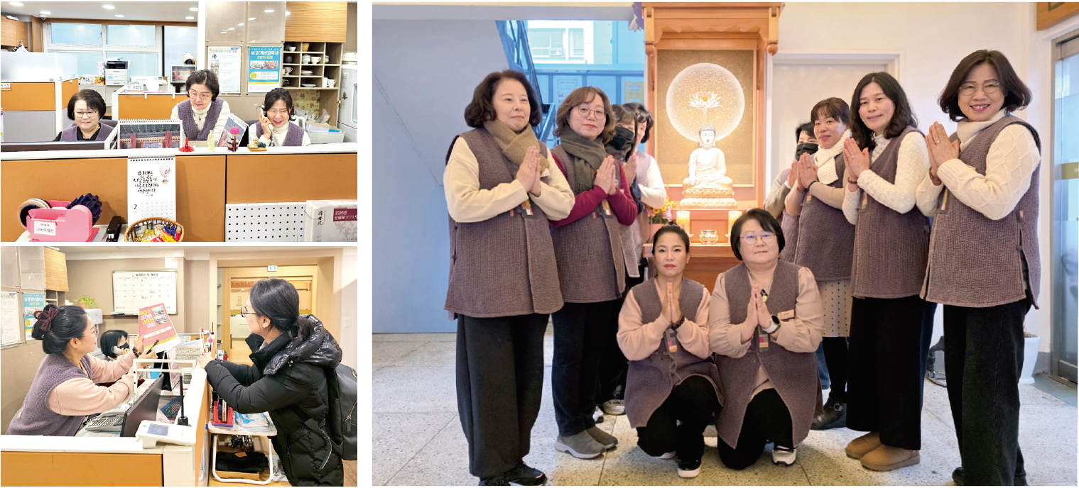 법회와 강좌, 각종 교육의 시작점에서 처음 방문한 분에게는 따뜻한 길잡이가 되고, 오랜 신도에게는 익숙한 도반이 되어, 누구나 편안한 마음으로 배움의 자리에 들어설 수 있도록 돕고 있습니다.