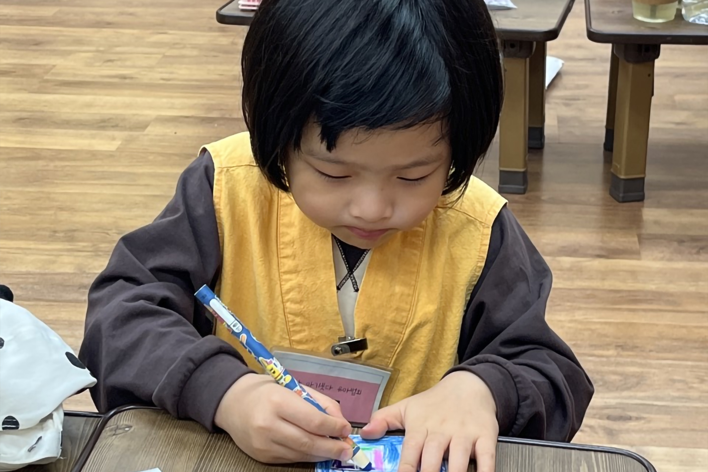 <유아 법회>에서는 ‘사경 법회’로 진행되었다. 아기붓다 유아 법우들이 반야심경의 지혜를 미리 경험할 수 있도록, 눈높이에 맞춘 한글 반야심경 사경 활동을 준비하였다. 한글을 아직 잘 모르는 법우들도 쉽게 참여할 수 있도록 맞춤형으로 진행하여, 모두가 마음을 모아 정성껏 반야심경을 한 글자씩 쓰며 법의 의미를 깊이 새기는 시간이었다. 이처럼 사경을 통해 마음을 고요히 하고, 부처님의 가르침을 몸과 마음으로 체득하는 법우들의 모습이 참으로 아름다웠다.