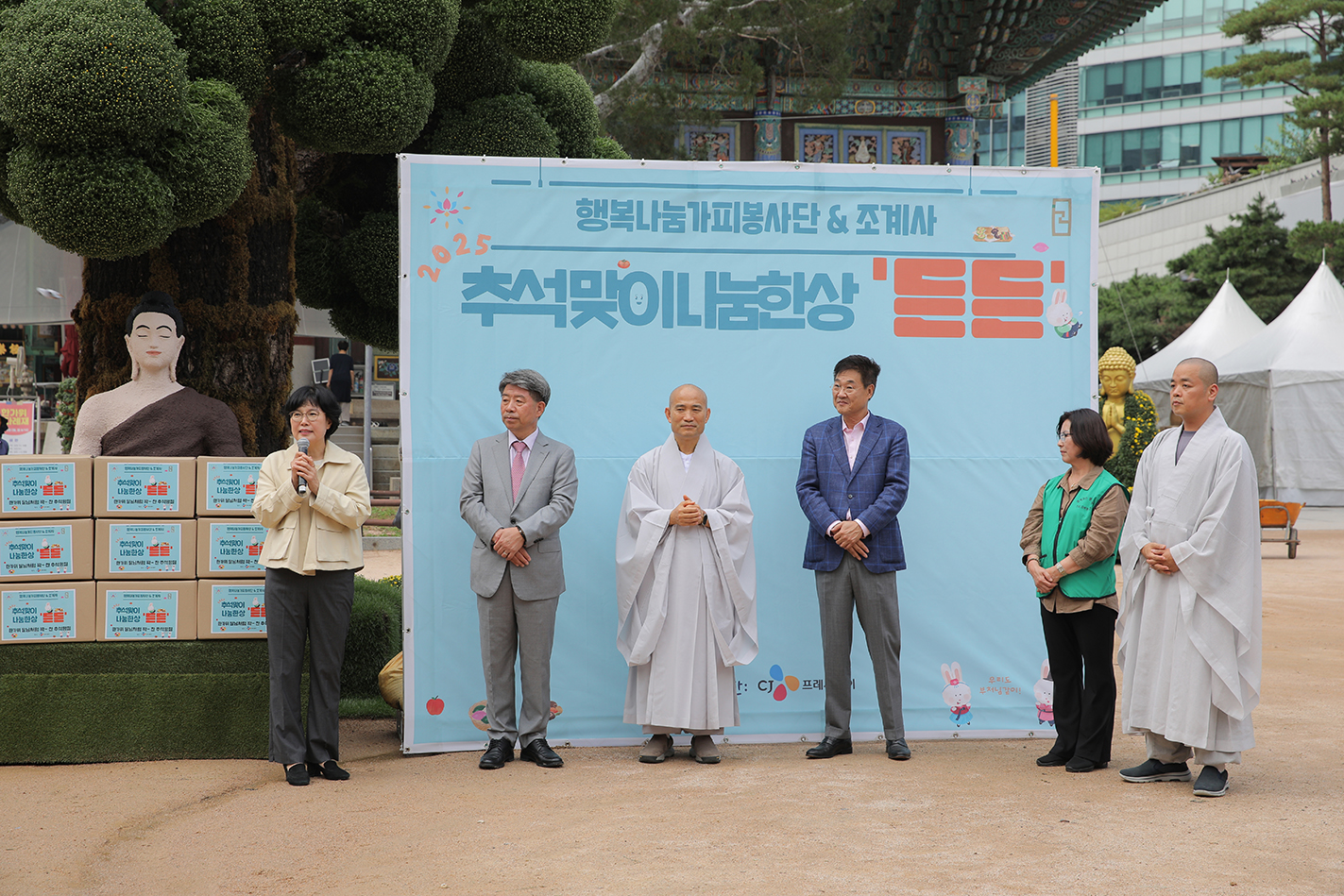 민족의 명절 추석을 일주일여 앞둔 9월 25일 오전 11시 30분 행복나눔 가피봉사단과 조계사가 함께하는 ‘2025 추석맞이, 나눔한상'든든'이 진행되었다. 이날 전달식에는 조계사 주지 담화 원명 스님, 사회사서국장 명경 스님, 정문헌 종로구청장, 무애 이승현 신도총회장, 이현경 행복나눔 가피봉사단 상임이사, 박수정 사회법회장 등이 참석했다.