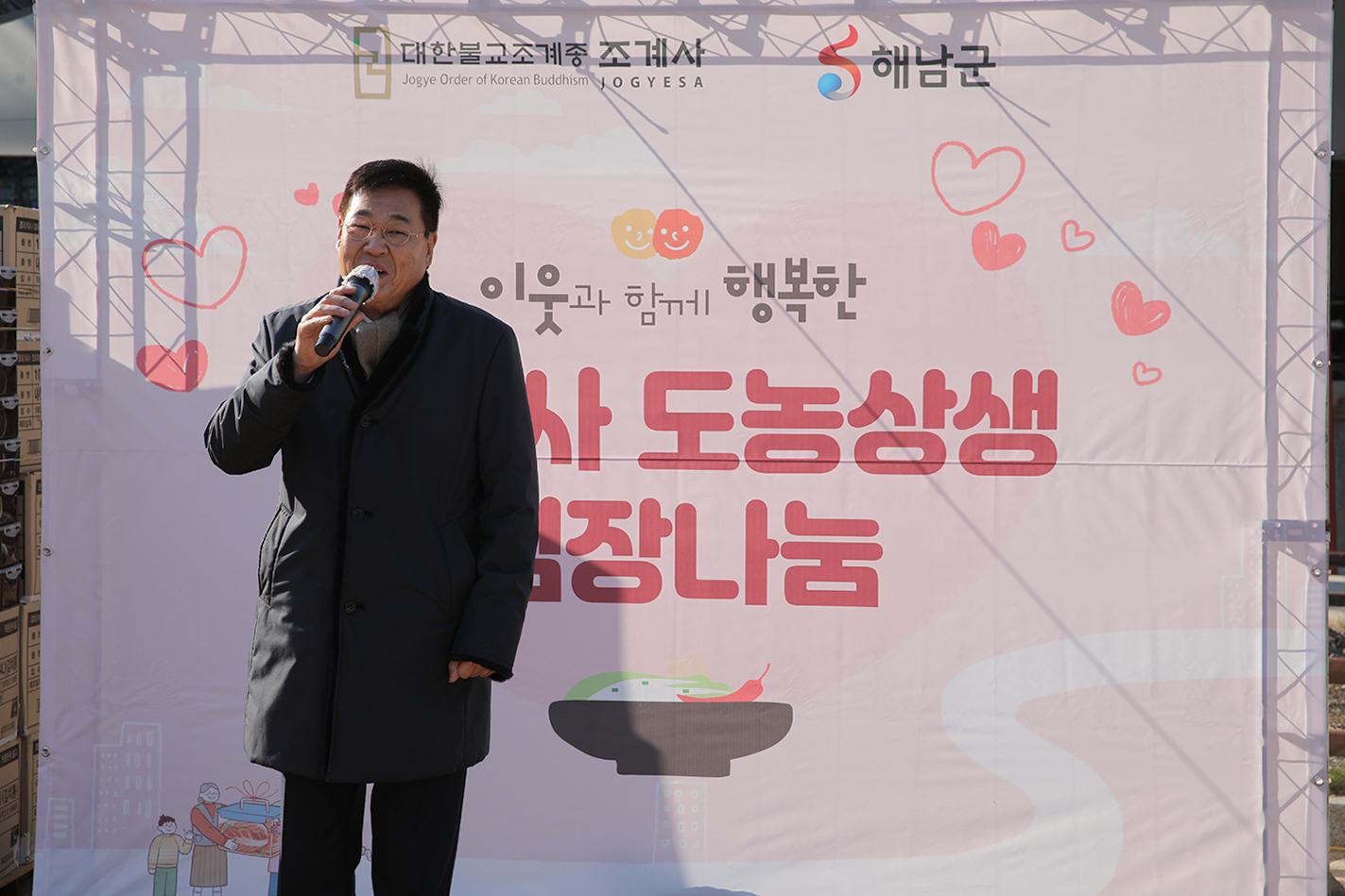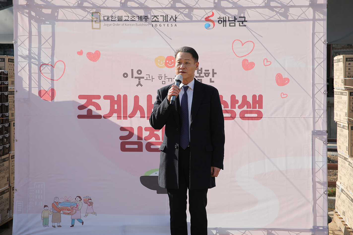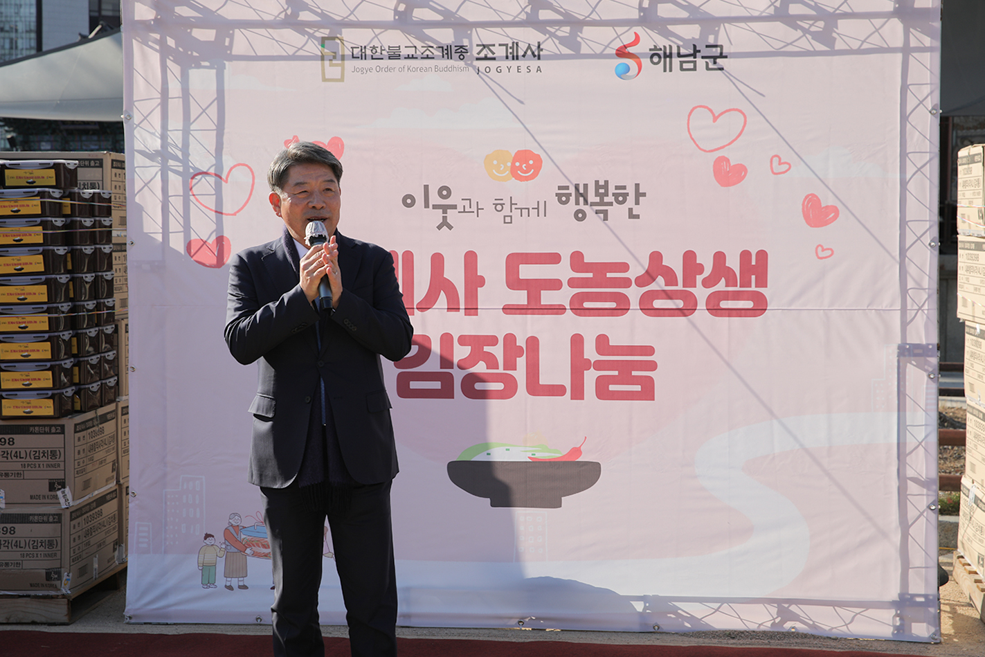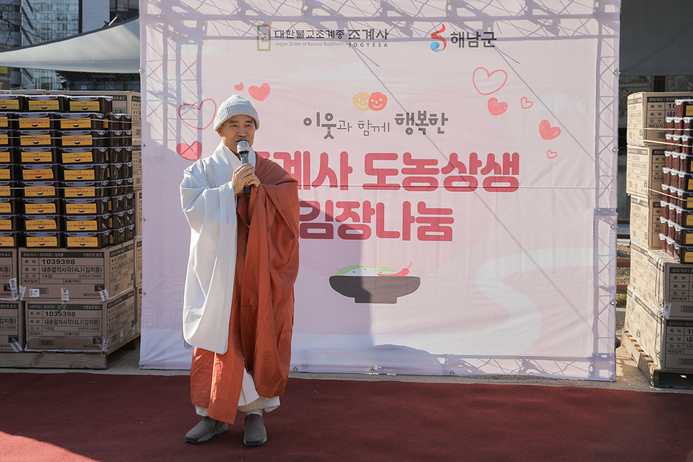 조계사 주지 담화 원명스님은 “오늘 날씨가 매우 춥습니다. 작년 김장날에는 눈이 많이 내렸던 기억이 납니다. 바쁜 일정 속에서도 해남에서 이렇게 참석해 주셔서 감사드립니다. 많은 분들이 함께해 주신 덕분에 큰 힘이 되었습니다. 추운 날씨지만 정성이 모이면 온정으로 추위를 이겨낼 수 있습니다. 어려운 이웃들에게 도움이 될 수 있도록 정성을 모아 주셨습니다. 다시 한 번 참석해 주신 분들, 그리고 아낌없이 지원해 주신 모든 분들께 감사 인사를 드립니다. 세상이 점점 살기 어려워지고 있지만, 내년에는 보다 즐겁고 따뜻한 연말과 한 해가 되기를 바랍니다.”라고 말했다.