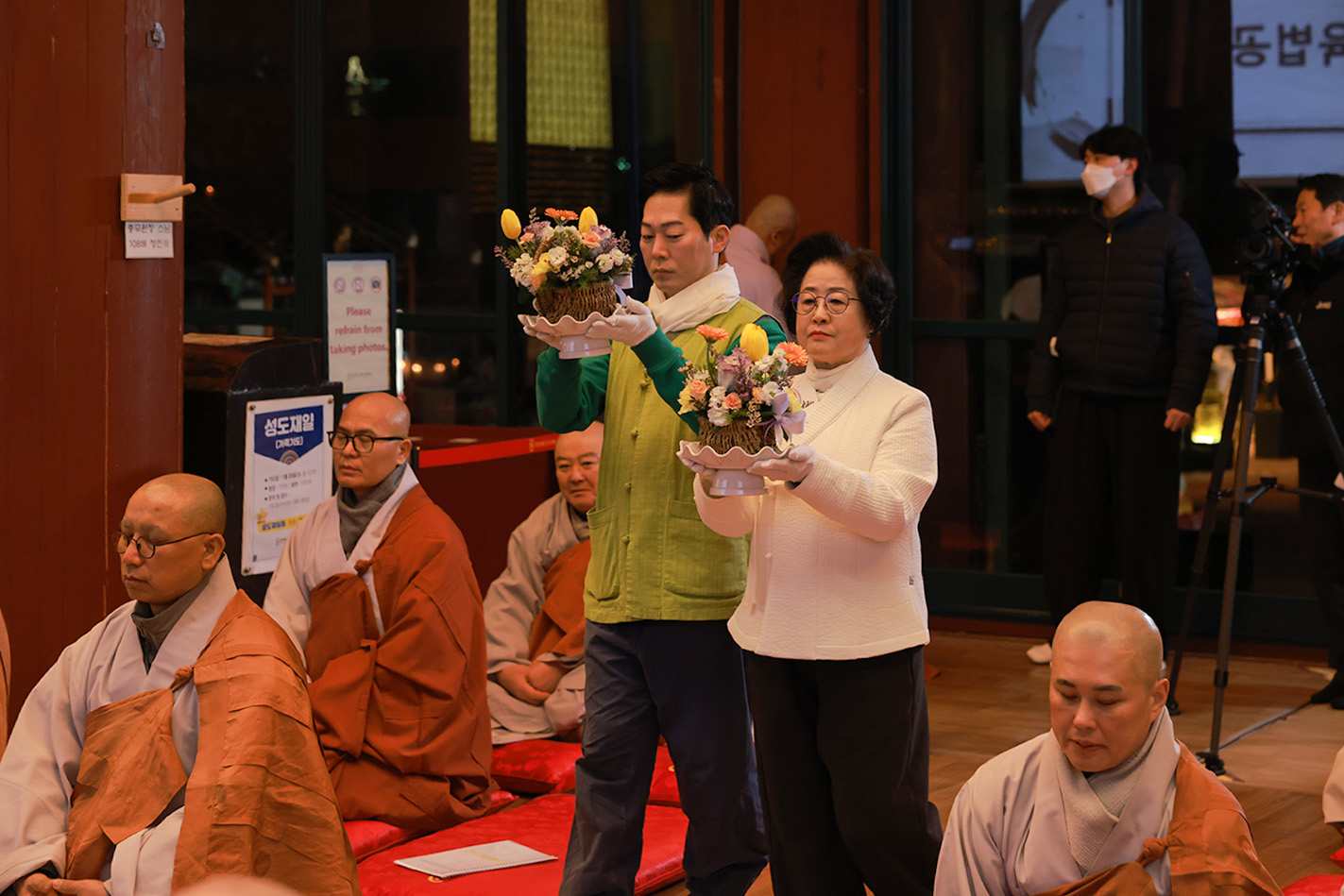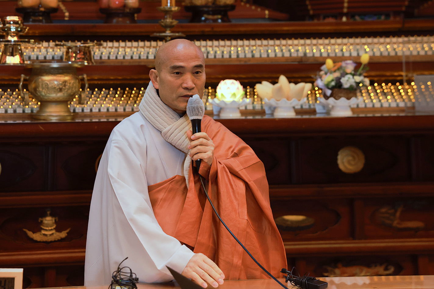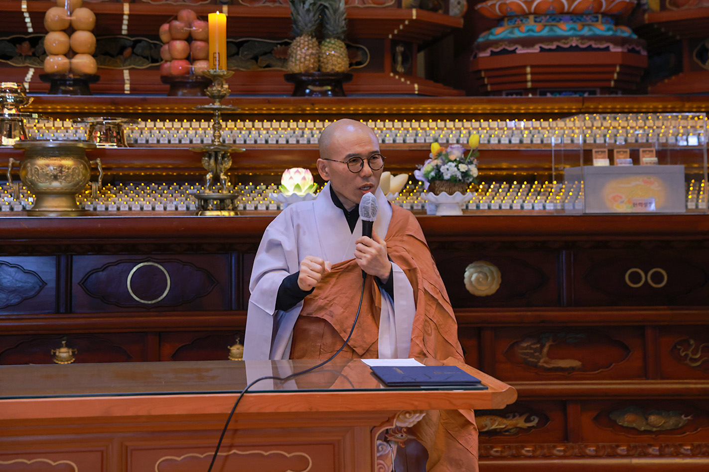 무거운 당구공과 깃털 중 어느 것이 먼저 떨어질지 생각해 보면,당연히 당구공이 먼저 떨어지지만 진공 상태에서는 무거운 당구공과 가벼운 깃털이 동시에 떨어진다고 합니다. 모든 물체는 조건에 따라 달라지며, 그 조건이 바로 인연법입니다. 부처님의 가르침이 나의 삶과 어떤 관계가 있는지, 어떻게 지혜롭고 자비롭게 변화시켜야 할지 스스로 고민해야 합니다. 부처님의 형상에만 집착해 머물러 있지 말고, 법당을 벗어나 삶 속으로 나아가야 합니다. 그동안 깨닫지 못하고 변화하지 못한 지난날을 참회하고, 밝고 지혜롭게 살겠다는 발심을 하는 날이 되기를 바랍니다. 소중한 이 삶이 불보살님의 가피와 화엄성중의 가호 속에 늘 함께하기를 바랍니다.”라고 인사말을 전했다.
