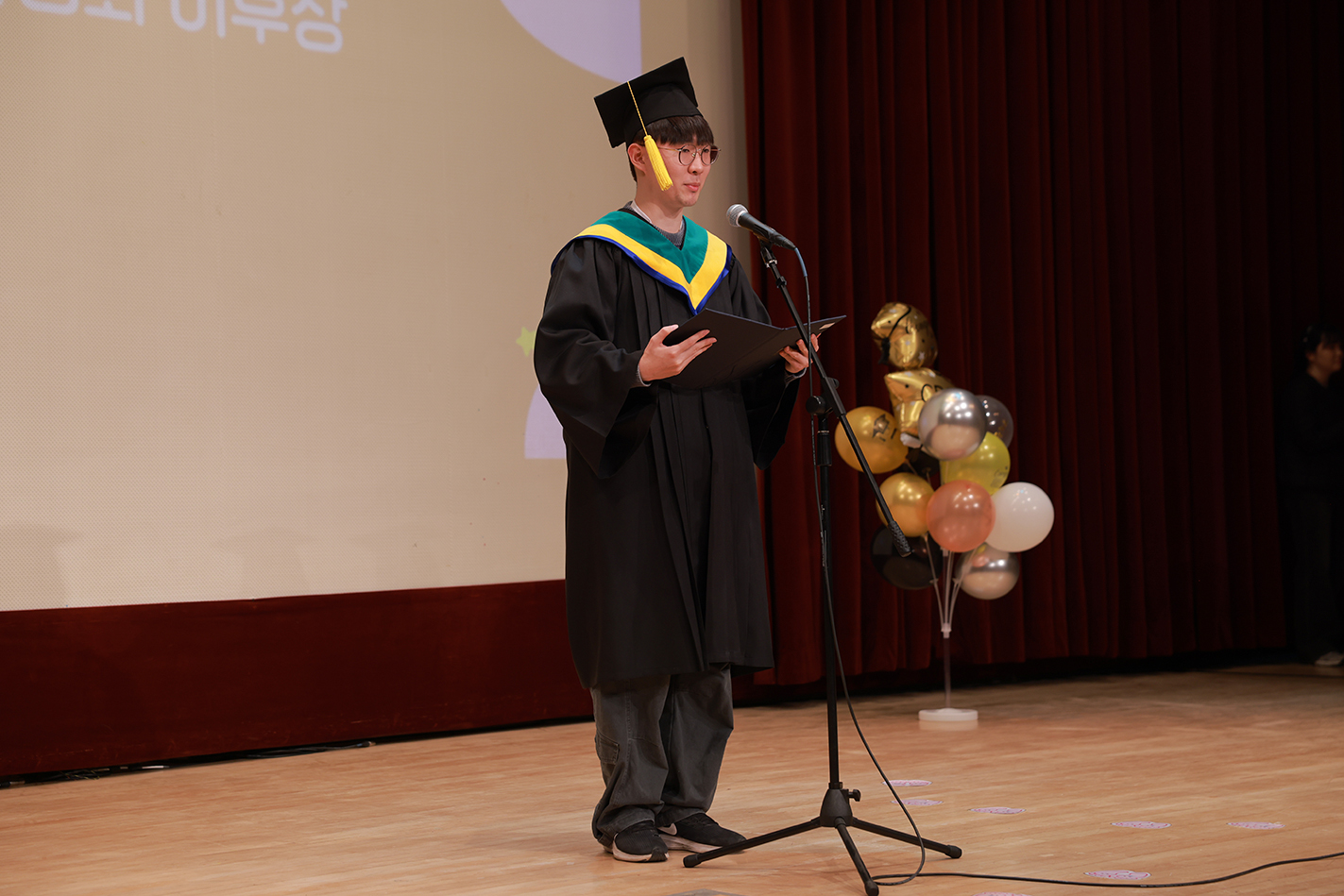 재학생 대표 이승민 법우는 "오늘 이 자리에서 졸업하시는 선배님들을 뵈니 정말 빛이 납니다. 선배님들이 졸업하신다니 기쁜 마음이 99%지만, 이제 누가 저희를 챙겨주나 하는 걱정이 1% 정도 섞여 아주 조금 아쉽기도 합니다. 졸업은 아쉬운 마무리라고들 하지만, 오늘만큼은 새로운 시작을 축하하는 우리의 파티라고 생각했으면 좋겠습니다.
