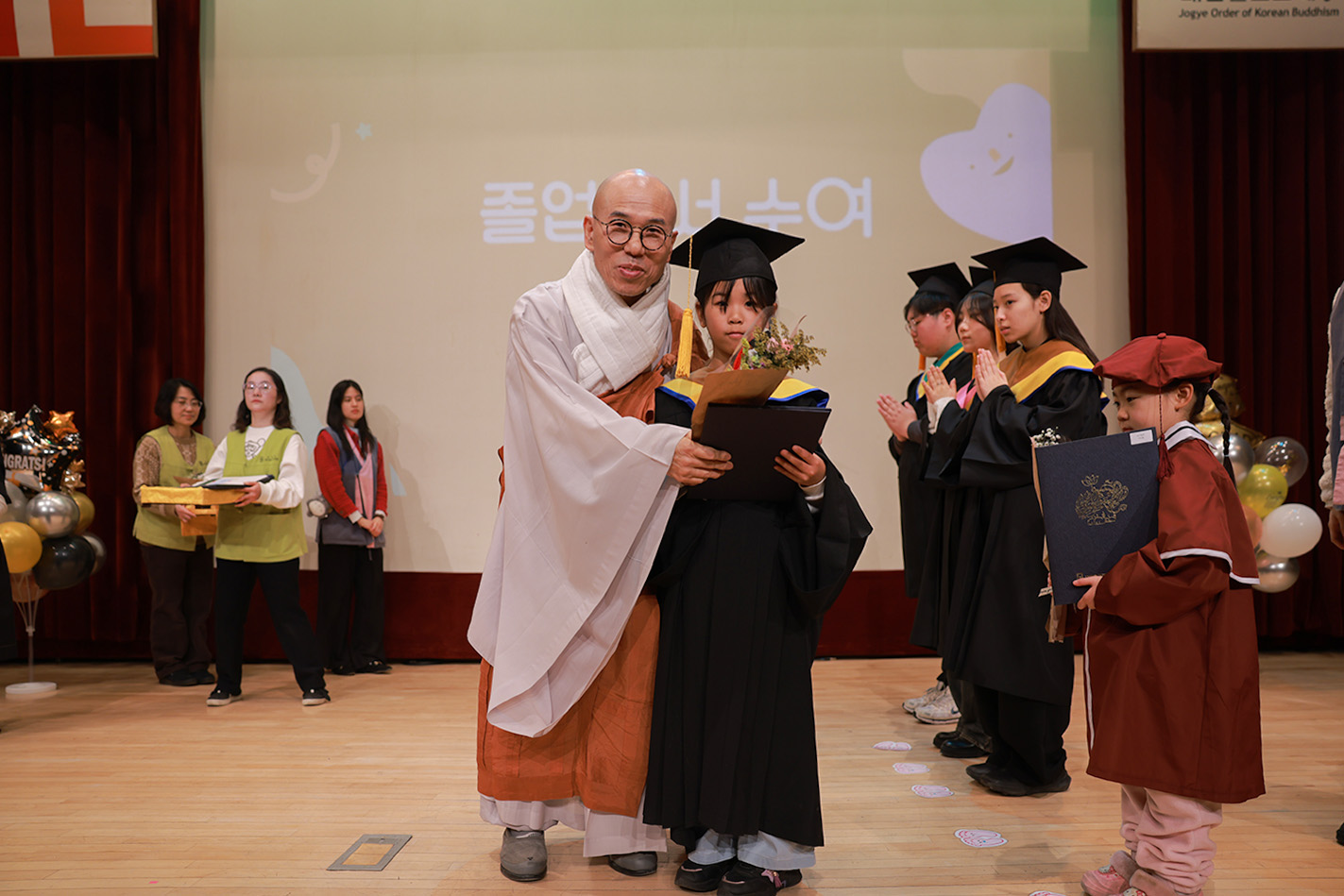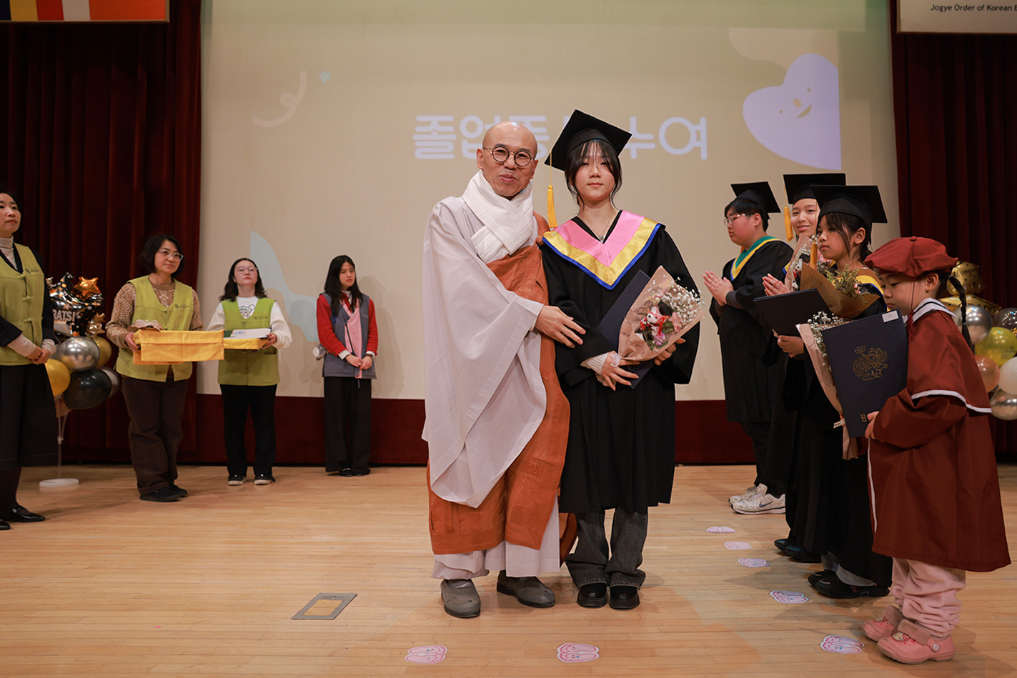 졸업생 여러분, 오늘 조계사를 떠나는 것처럼 보이지만 떠나지 마십시오. 상급법회, 청년법회, 신도회 등으로 계속 이어가며 이 도량과 인연을 놓지 않기를 바랍니다. 법회를 떠나지 않고 수행과 봉사를 이어간다면, 그 삶 자체가 성공이라고 저는 확신합니다.
