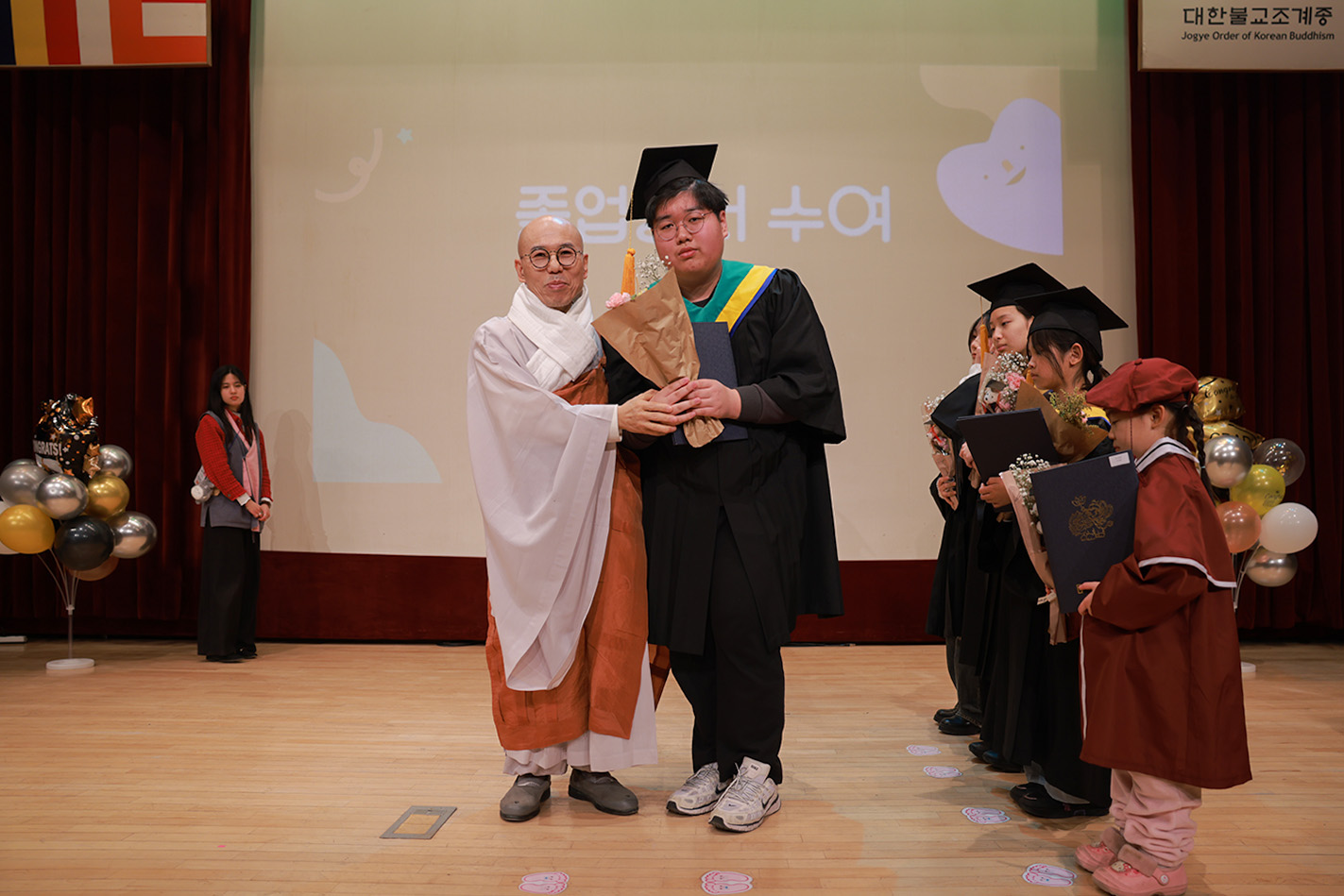 졸업은 하나의 문을 닫고 새로운 문을 여는 과정입니다. 문 너머의 세상이 때로 낯설고 두렵게 느껴질 수도 있습니다. 하지만 여러분에게는 이미 부처님의 지혜라는 훌륭한 나침반이 있습니다. 정직하게 노력하고 바르게 생각하며 이웃을 아끼는 마음으로 살아간다면 어떤 어려움도 능히 이겨낼 수 있으리라 확신합니다. 여러분이 사회 곳곳에서 제 역할을 다하는 훌륭한 인재로 성장하는 것은 우리 신도들에게 가장 큰 보람이 될 것입니다. 오늘 맺은 이 소중한 인연의 끈을 놓지 말고, 더욱 큰 원력을 세워 세상을 맑고 향기롭게 만드는 주역이 되어 주시길 바랍니다. 여러분의 가정에 늘 평화와 행복이 깃들기를 발원합니다."라고 축사를 전했다.