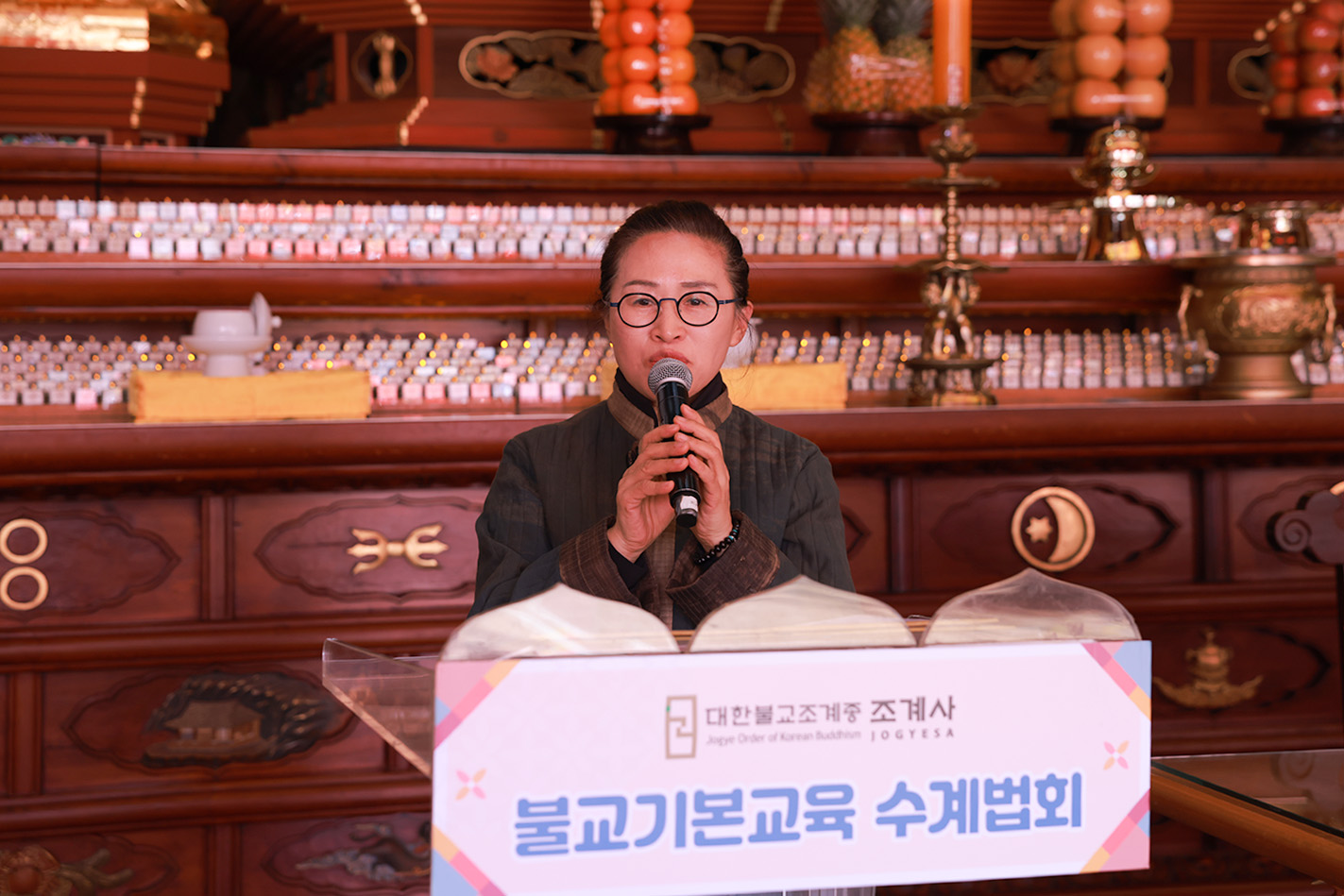 호연 김경숙 교육수행법회장 "부처님의 가르침을 체계적으로 배우는 불교 기본교육 과정을 마치고, 수계식에서 불자 오계를 수지하신 교육생 여러분께 진심으로 축하의 말씀을 드립니다. 또한 “이번 생은 전법”이라고 말씀하신 주지스님의 가르침이야말로, 오늘 이 자리에 가장 큰 법문으로 새겨집니다.