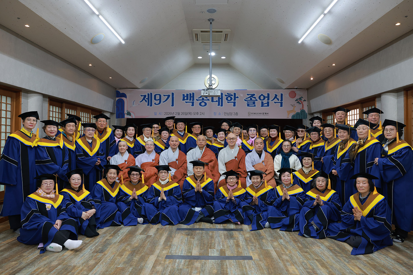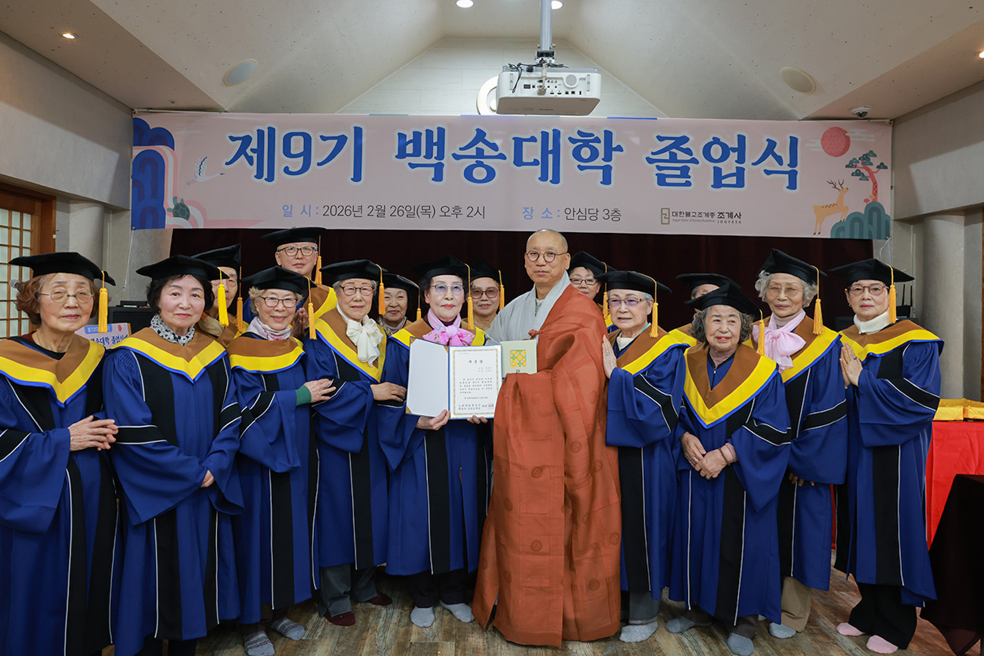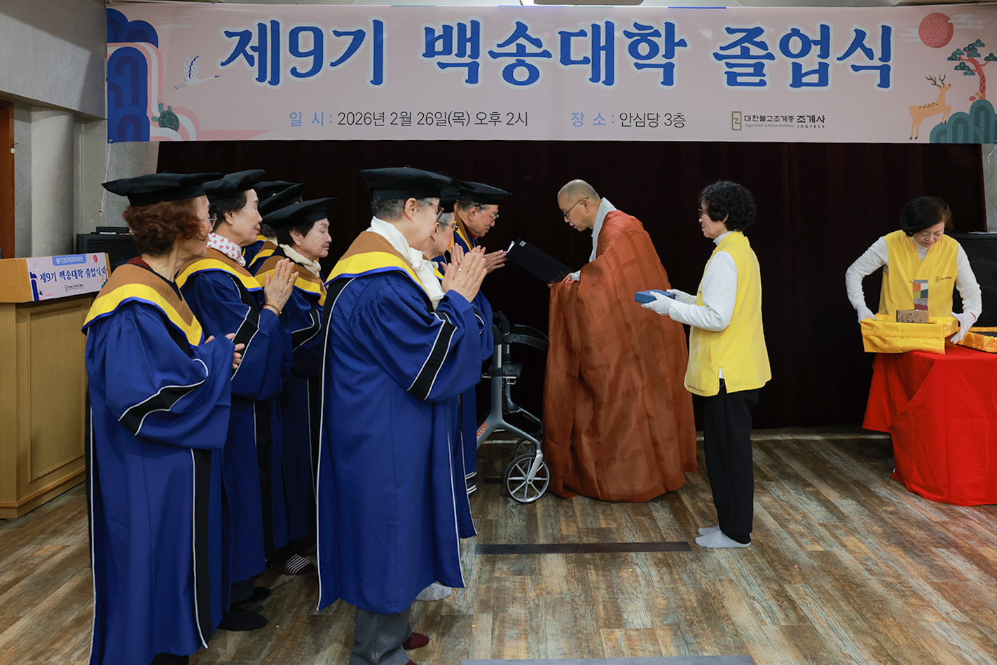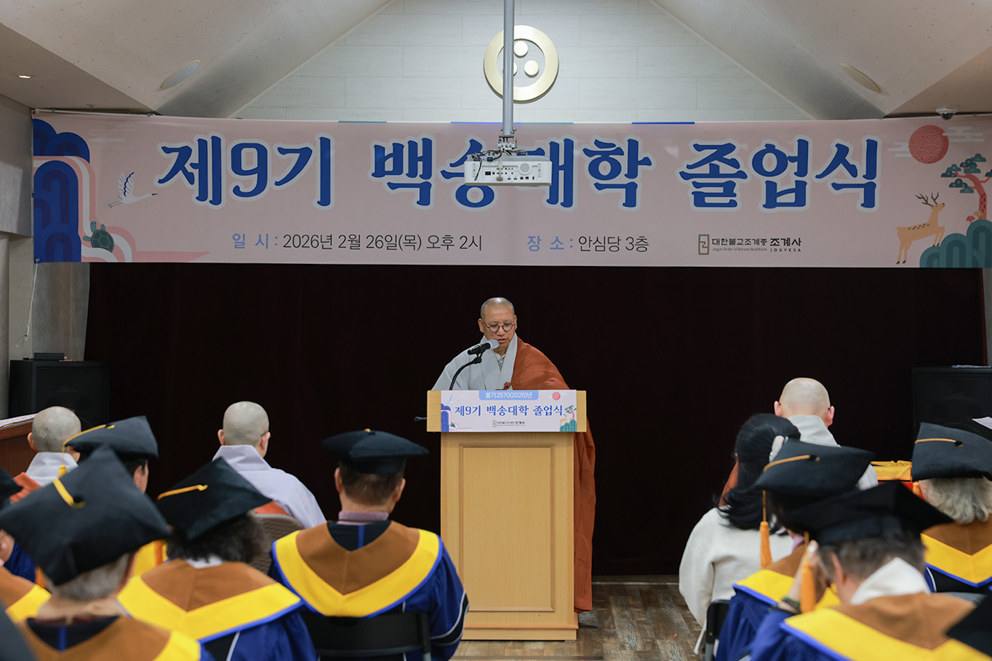 조계사 백송대학이 2월 26일(목) 오후 2시 조계사 관음전에서 한 해 동안의 교육을 마무리하는 졸업식을 개최했다. 제9기 백송대학은 2025년 3월에 개강하여 1학기 13주, 2학기 12주간의 수업으로 법문, 특강, 전문강사 초청 교양강좌를 진행했다. 졸업식은 삼귀의·반야심경 봉독, 교육수행원장스님 치사, 졸업증서 수여, 상장 수여, 졸업생 졸업사, 교육수행원장스님 축사, 신도회 축사, 기념촬영 순으로 진행됐다.