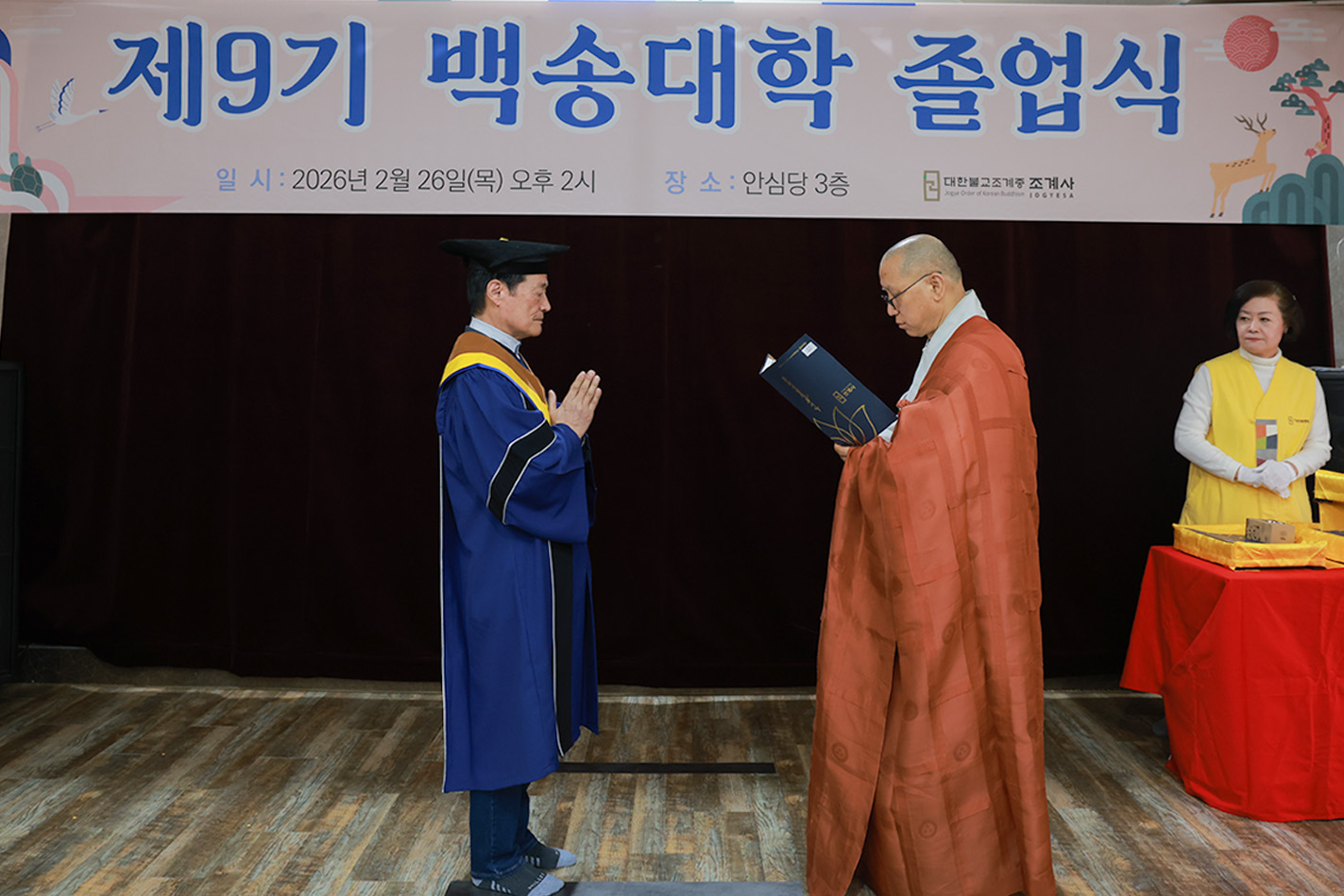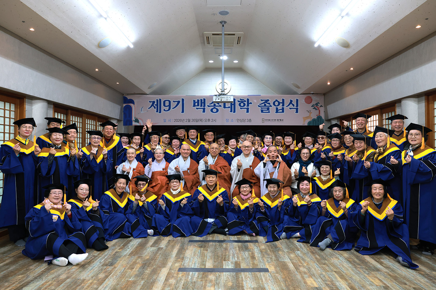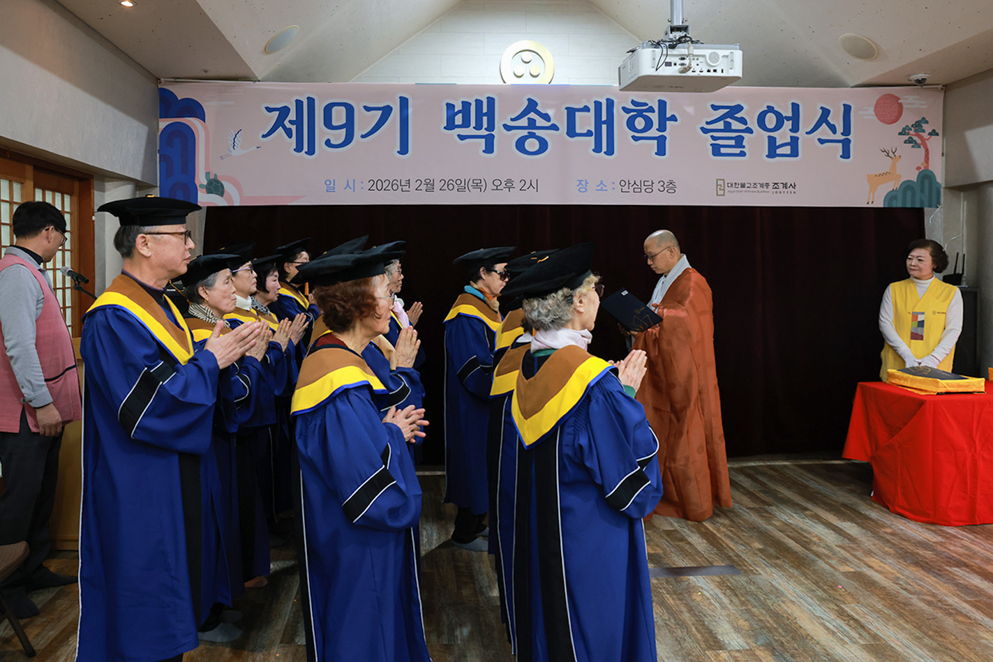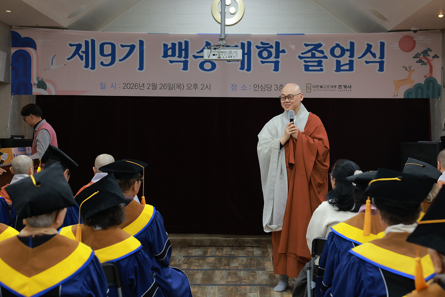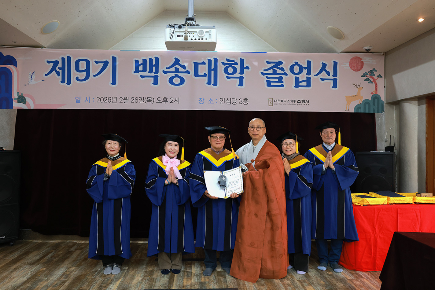 조계사 백송대학이 2월 26일(목) 오후 2시 조계사 관음전에서 한 해 동안의 교육을 마무리하는 졸업식을 개최했다. 제9기 백송대학은 2025년 3월에 개강하여 1학기 13주, 2학기 12주간의 수업으로 법문, 특강, 전문강사 초청 교양강좌를 진행했다. 졸업식은 삼귀의·반야심경 봉독, 교육수행원장스님 치사, 졸업증서 수여, 상장 수여, 졸업생 졸업사, 교육수행원장스님 축사, 신도회 축사, 기념촬영 순으로 진행됐다.