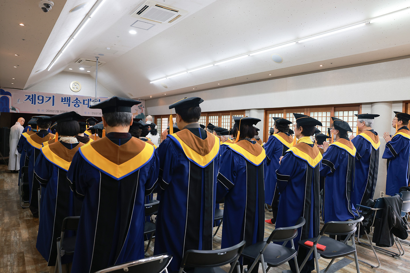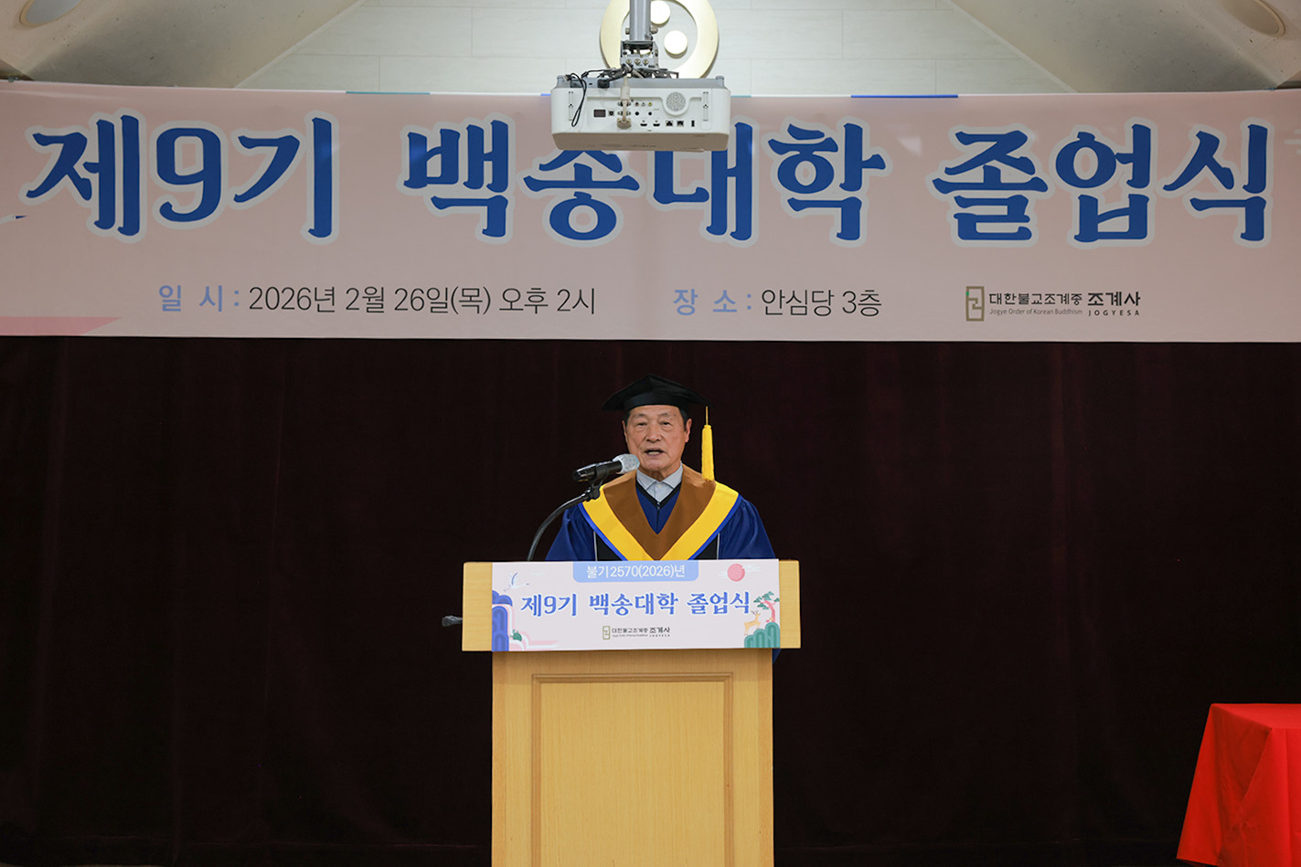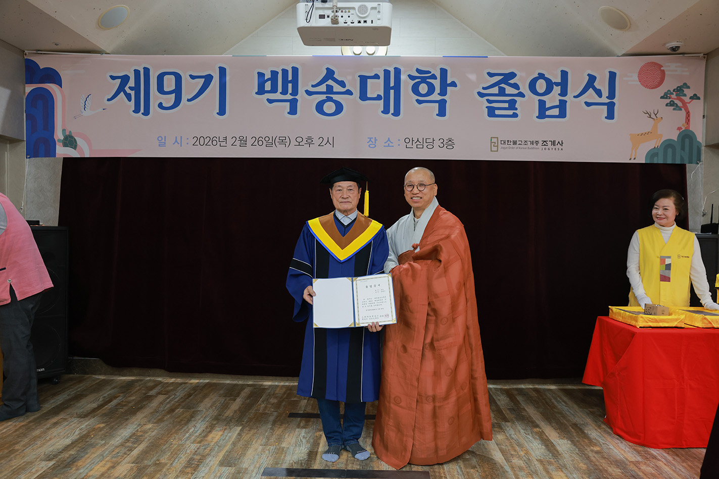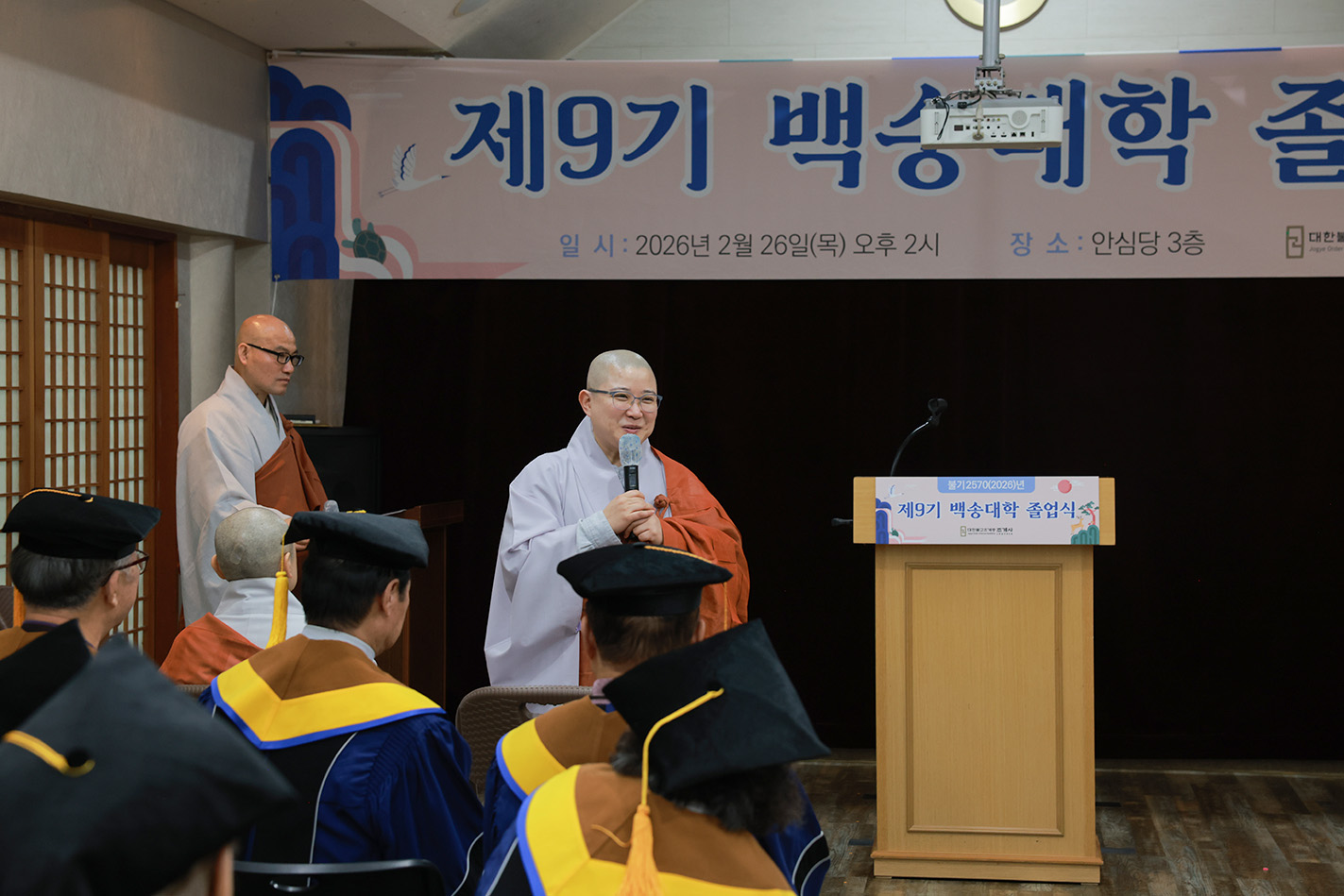조계사 백송대학이 2월 26일(목) 오후 2시 조계사 관음전에서 한 해 동안의 교육을 마무리하는 졸업식을 개최했다. 제9기 백송대학은 2025년 3월에 개강하여 1학기 13주, 2학기 12주간의 수업으로 법문, 특강, 전문강사 초청 교양강좌를 진행했다. 졸업식은 삼귀의·반야심경 봉독, 교육수행원장스님 치사, 졸업증서 수여, 상장 수여, 졸업생 졸업사, 교육수행원장스님 축사, 신도회 축사, 기념촬영 순으로 진행됐다.
