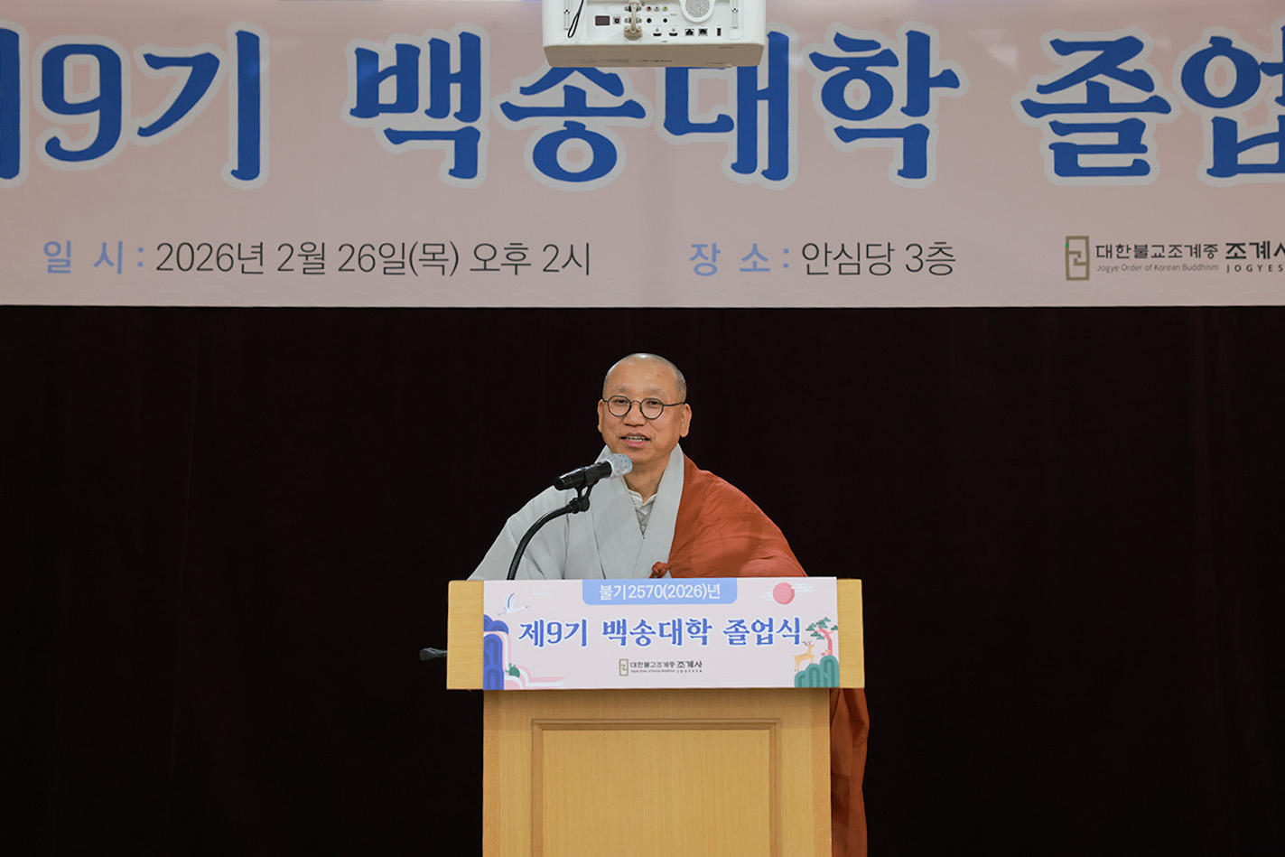 부처님 말씀처럼 좋은 벗을 얻는다는 것은 수행이든 인생이든 참으로 큰 복입니다. 우리가 부처님의 그늘 아래에서 마음을 닦고 불성을 밝혀가는 이 시간은 참으로 귀하고 훌륭한 시간입니다.여러분 덕분에 백송대학이 날로 발전하고 있습니다. 저 또한 마음이 편안하고 기쁘게 생각합니다. 다시 한 번 졸업을 진심으로 축하드립니다.” 라고 치사했다.