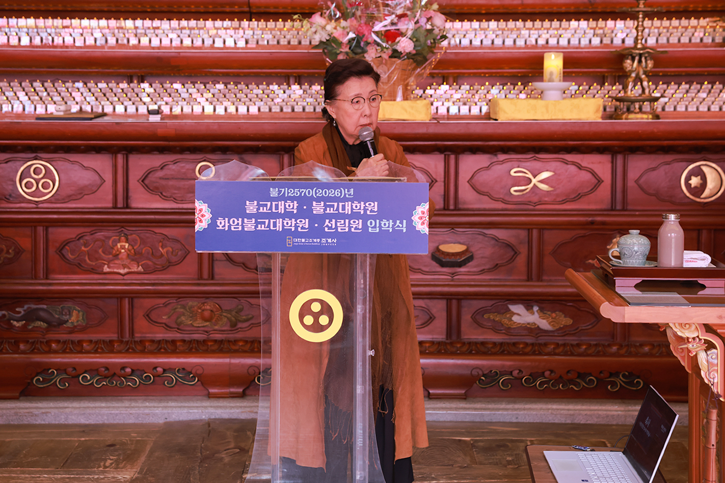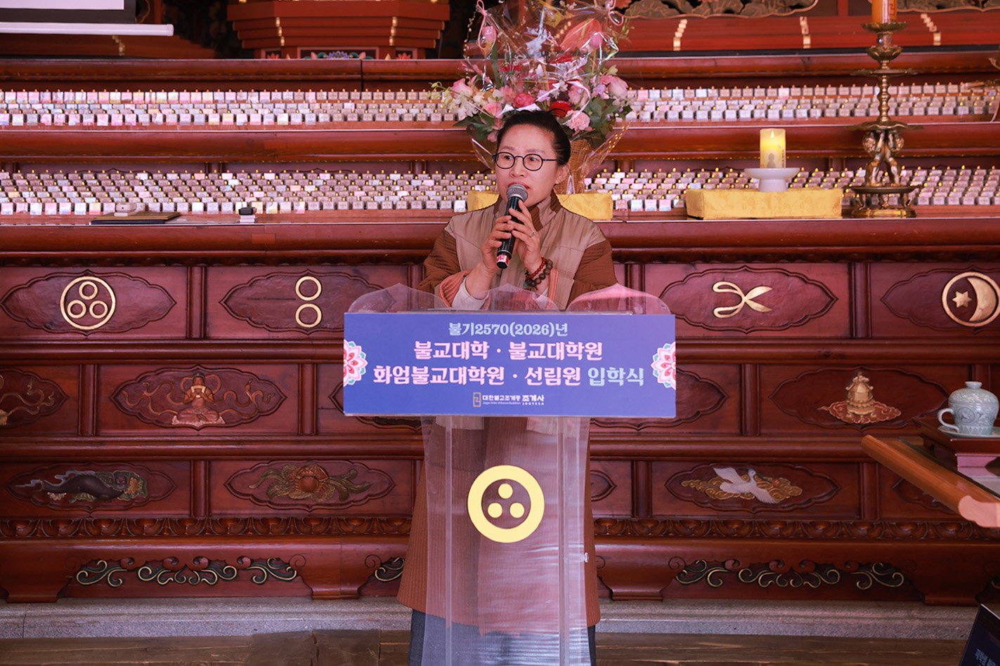 재학생 대표, 호연 김경숙 교육수행 법회장은 "바쁘신 가운데 함께해주신 모든 분들께 감사드리며, 신입생 여러분의 입학을 진심으로 축하드립니다. 오늘은 부처님의 가르침을 따라 마음의 길을 찾는 수행의 첫걸음입니다. 입학이 쉽지 않은 인연인 만큼 끝까지 정진하여 졸업하시기를 바랍니다.