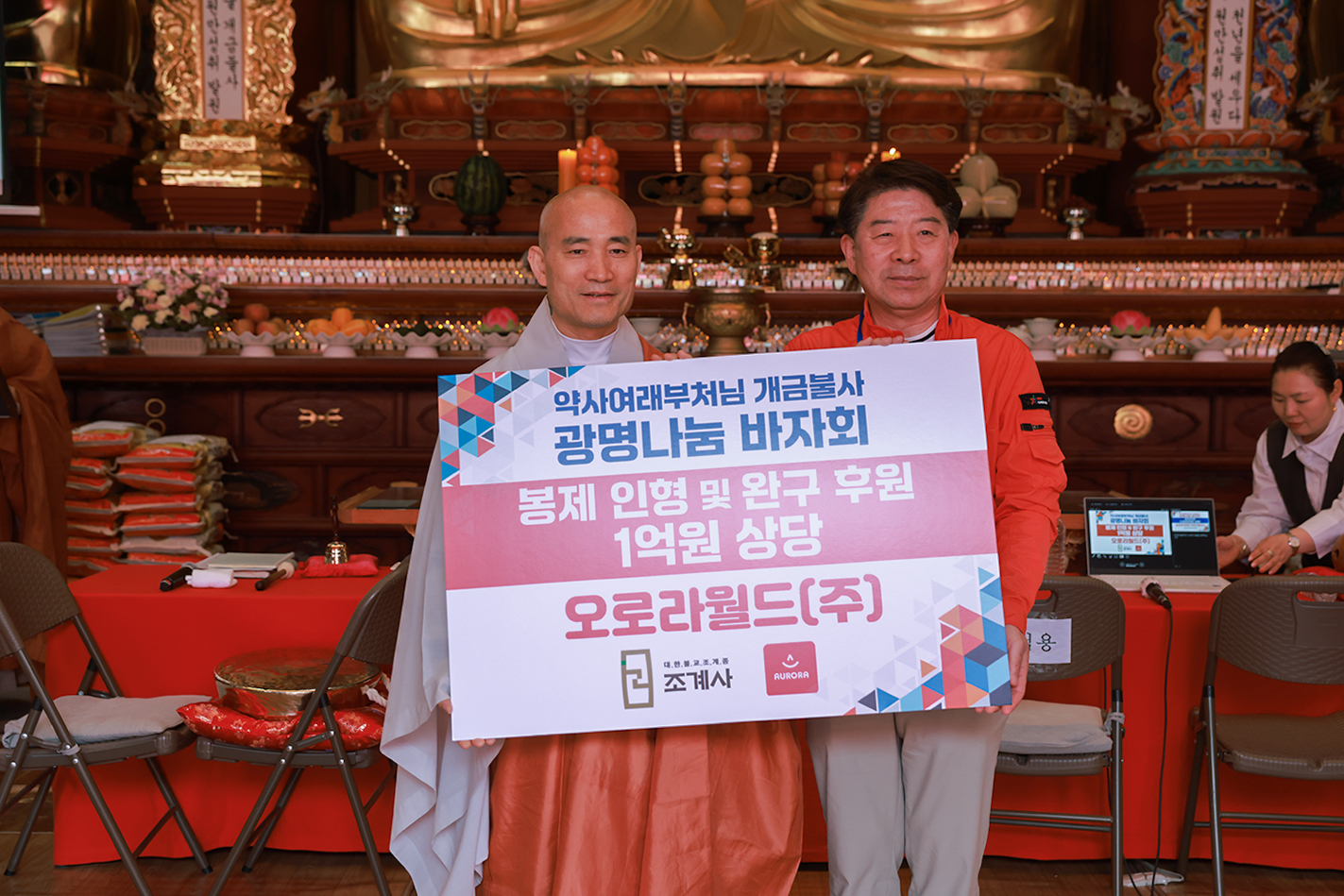 4월 17일(금) 조계사 대웅전에서 '약사여래부처님 개금불사 광명나눔 바자회'를 위해 (주)오로라 월드의 1억 원 상당의 봉제 인형 및 완구를 후원하는 전달식을 봉행했다.